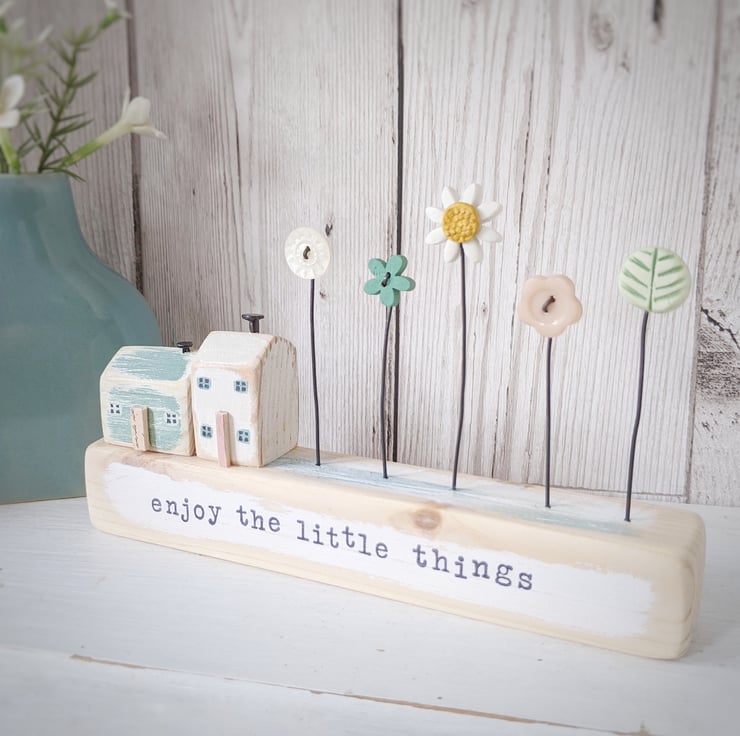 These little hand-painted wooden homes have teeny doors and windows and a garden of button and clay flowers.