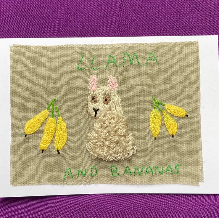 This cute, curly haired llama is surrounded by one of its favourite foods - bananas. The llama is hand embroidered onto natural linen and mounted on a white greetings card 4" x 6" and comes with matching envelope. The card has been left blank inside for your own message.