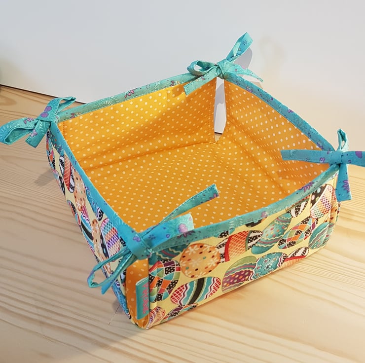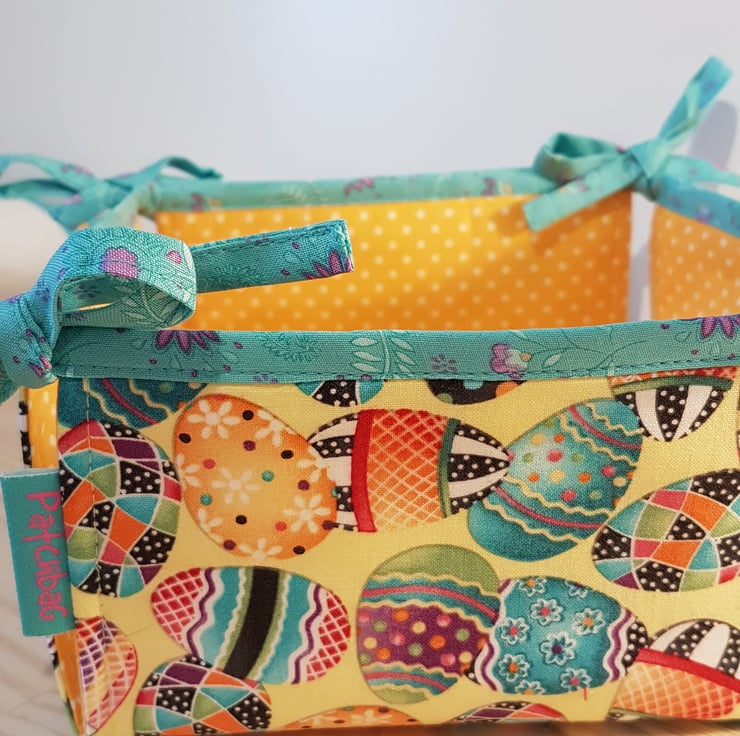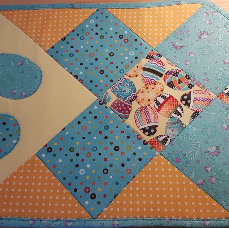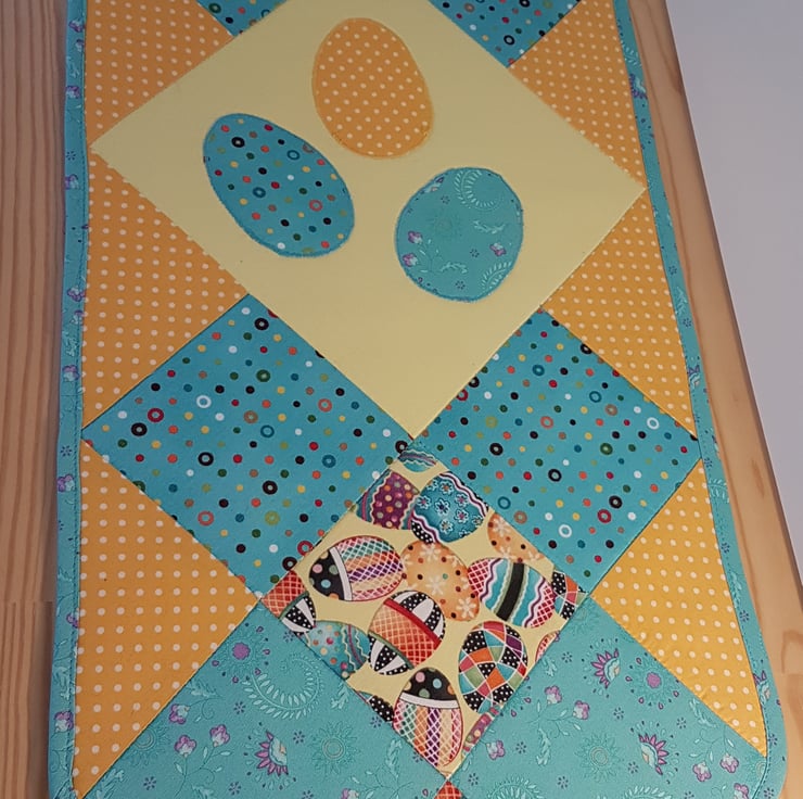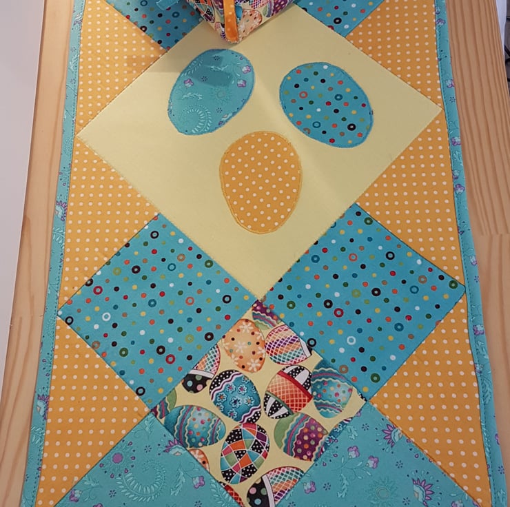 Handmade patchwork table runner with matching basket for napkins or Easter eggs or scones etc. Made for Easter home decoration. Main colors are pale yellow and turquise. I used cotton and polycotton fabrics. The middle of the table runner are aplique Easter eggs. Dimensions: the table runner is 87cm long and 29,5cm wide, the basket is 17x17cm and the hight is 10cm.