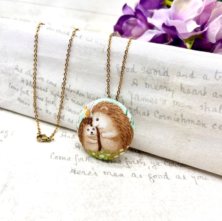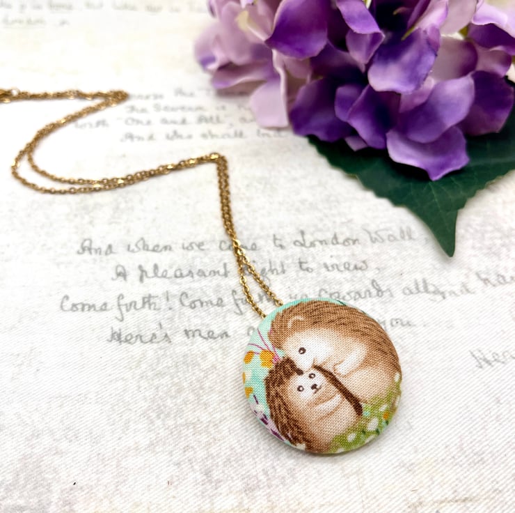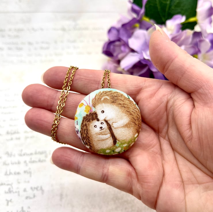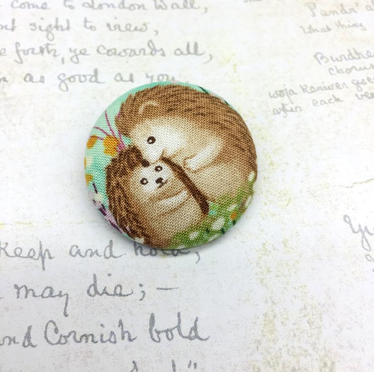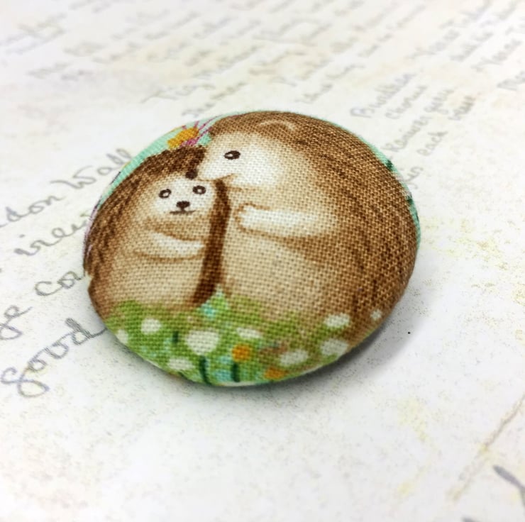 Made from 100% cotton fabric, I selected this cute Mother and baby hedgehog sitting in a garden with green grass and surrounded by flowers with an aqua blue sky background, then created a 38mm diameter fabric covered flat backed button.