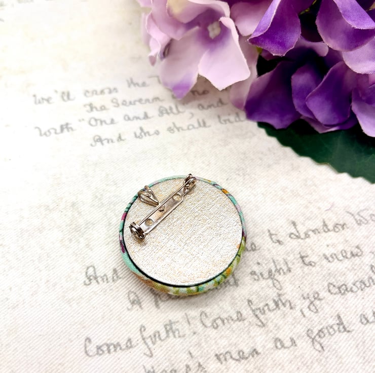 On the back of the button, I have glued a birch plywood circle within the button blank and painted it with light champagne gold metallic pain that's filled with mica, followed by a couple of layers of varnish for added protection. I've also added a silver plated brooch with safety back that also has a pendant bail, so there’s an option to convert it into a pendant!