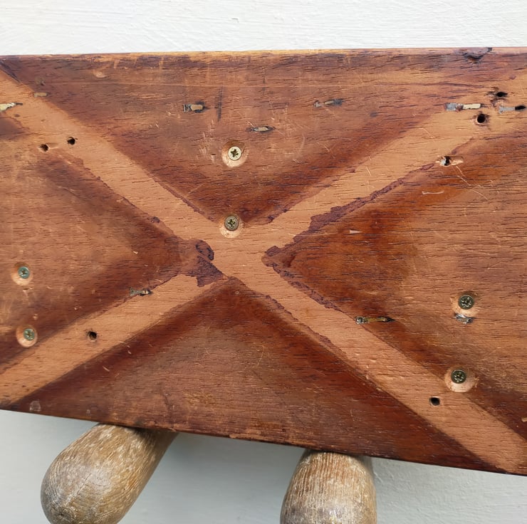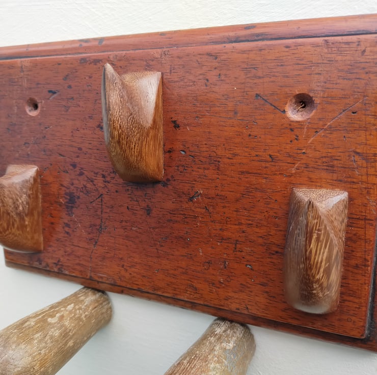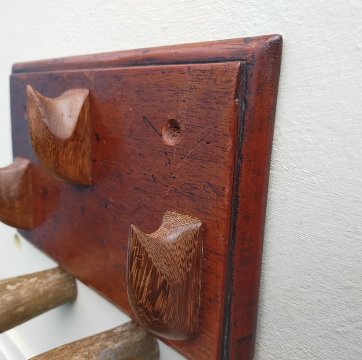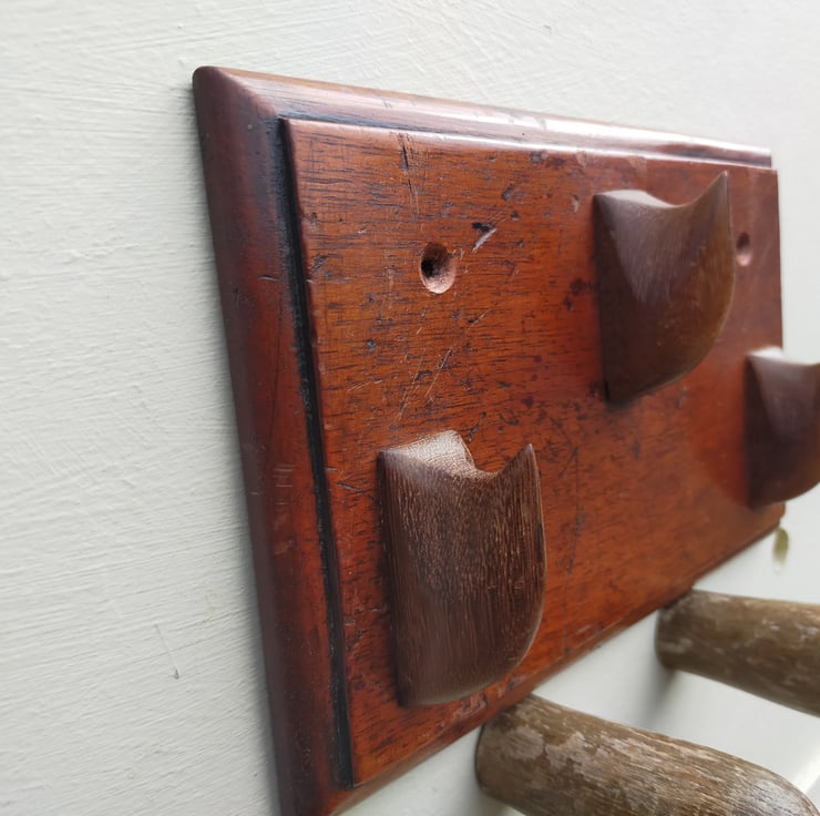 The reclaimed side table which provided the base for the "organ pipe" coat rack also supplied this smaller platform which was covering the cross-stretchers of the table. I have screwed and glued three individually hand-carved purpleheart hooks to the scratched and distressed base, and given it a light wax finish. This would look superb on a period bathroom or bedroom door. My pieces are absolutely unique and you will quite simply find nothing else like this for sale anywhere. L 265mm x H 165mm x D 50mm. Waxed finish.