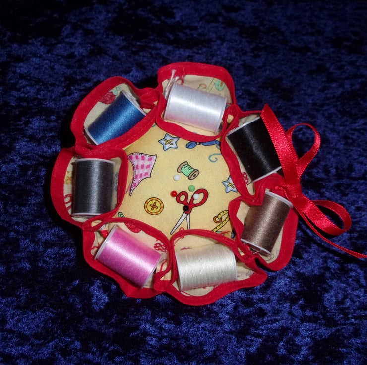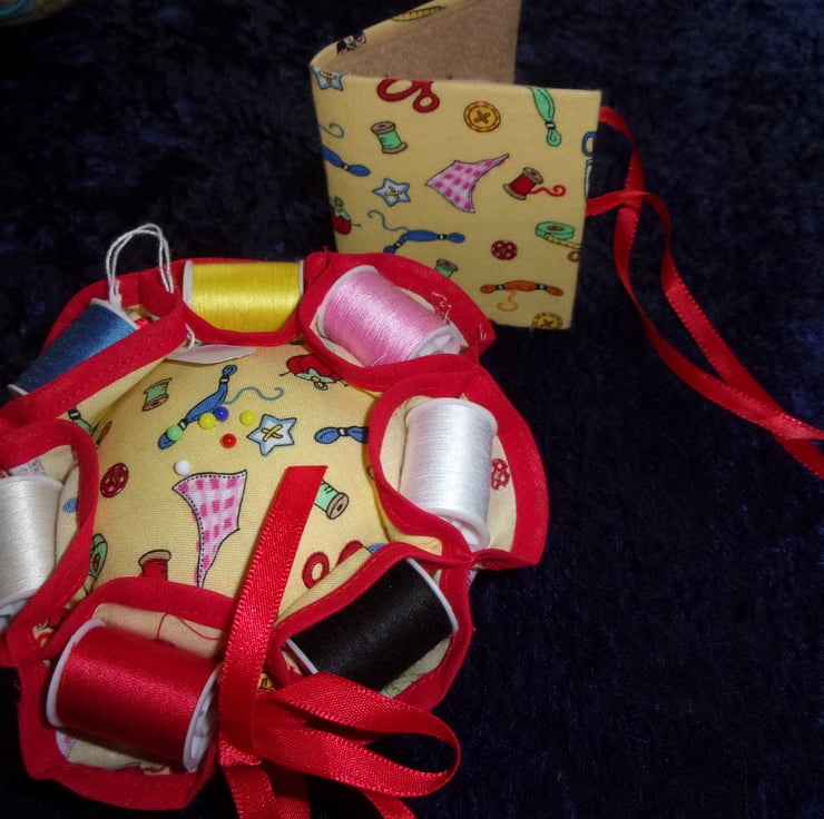 Made using two circles of cotton fabric the pin cushion is then edged with contrasting bias binding, it is stuffed using soft toy stuffing before the cotton reels are threaded onto ribbon and tied in a bow to stop them falling off. The needle case is covered in the same fabric as the pin cushion and is lined using beige felt for holding the needles and both would make an ideal addition to your sewing kit.