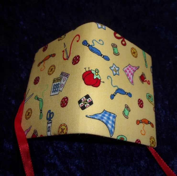 The design on this set is embroidery threads, buttons and cotton reels on a yellow background and the pin cushion is edged with a contrasting red bias binding, the needle case has red ribbon for tying up to keep it closed.