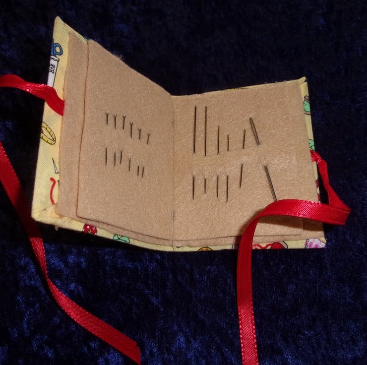 The needle case comes with a small selection of sewing needles and dressmakers pins with space for adding more.