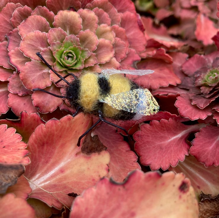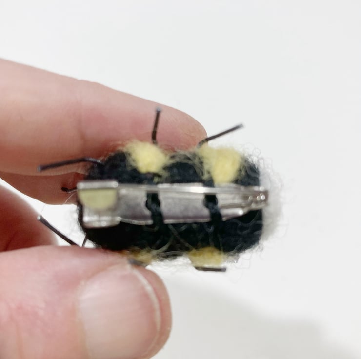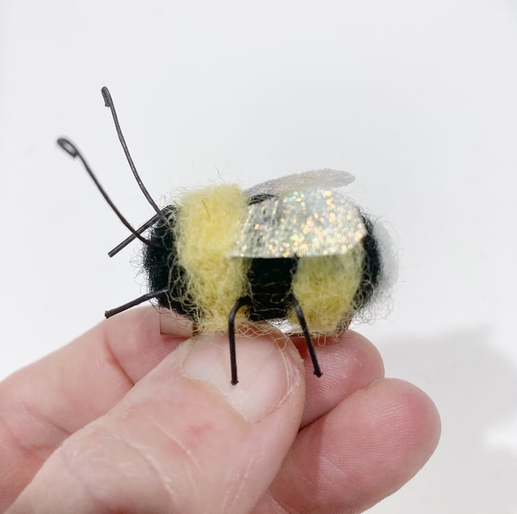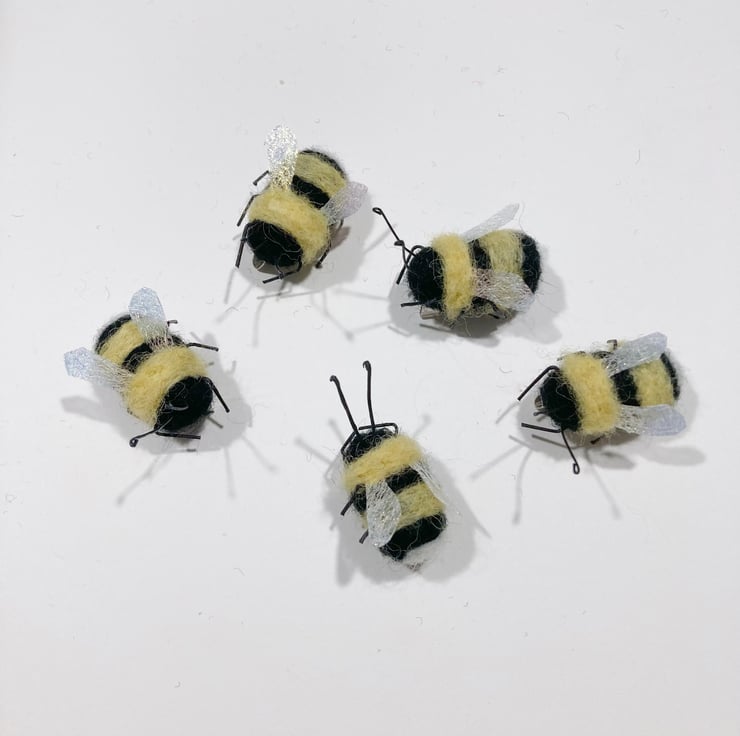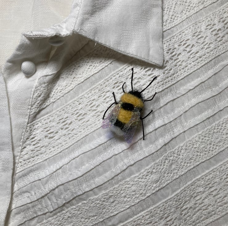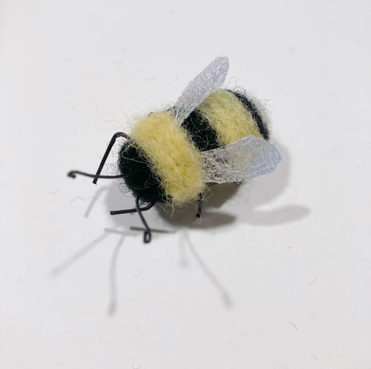 This bumble bee has been needle felted using woollen fibres. The legs and antennae are wired and his wings are formed from Angelina fibres. A small silver tone brooch pin has been attached to the reverse. The body of the bee measures approximately 2.5cm in length.