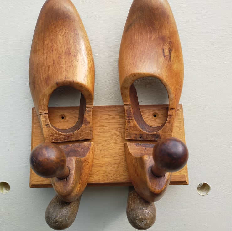Vintage shoe tree or shoe stretcher, probably beech, deconstructed and mounted on a reclaimed Brazilian mahogany plaque, with two countersunk screw holes for fixing to a bathroom or bedroom door. Suitable for towels, dressing gowns etc. A distinctive and unusual addition to your home decor. waxed finish, L 230mm x H 270mm x D 170mm. Free delivery.