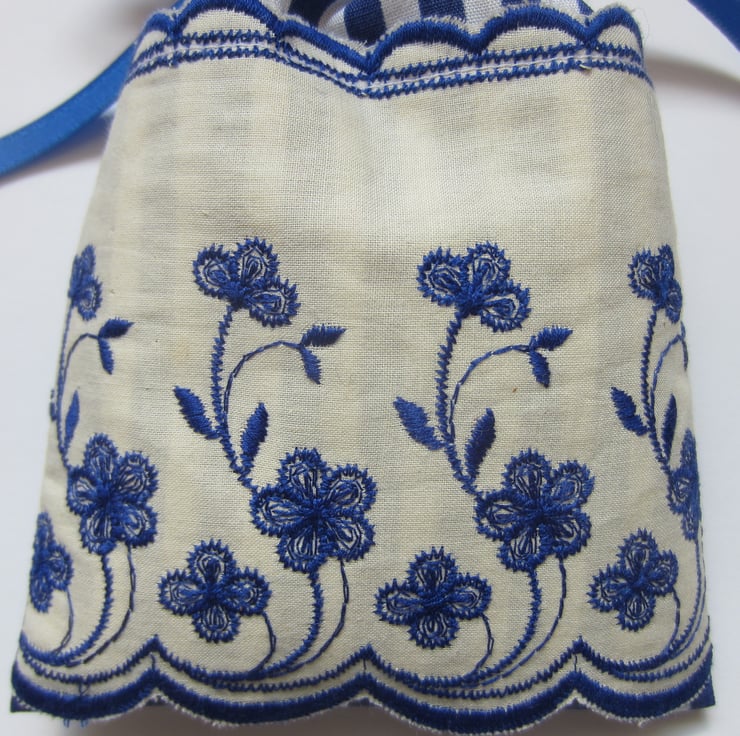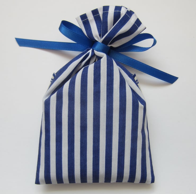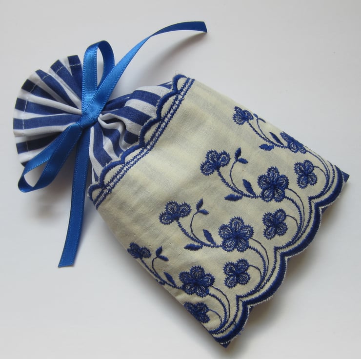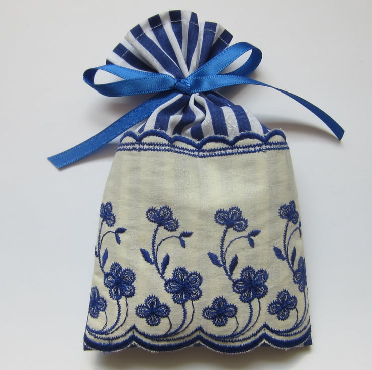 Lavender drawer sachet made from blue and white striped fabric and decorated with a vintage flower design trim.