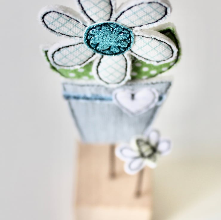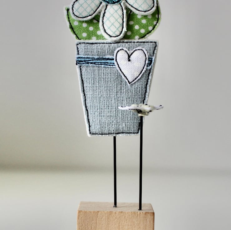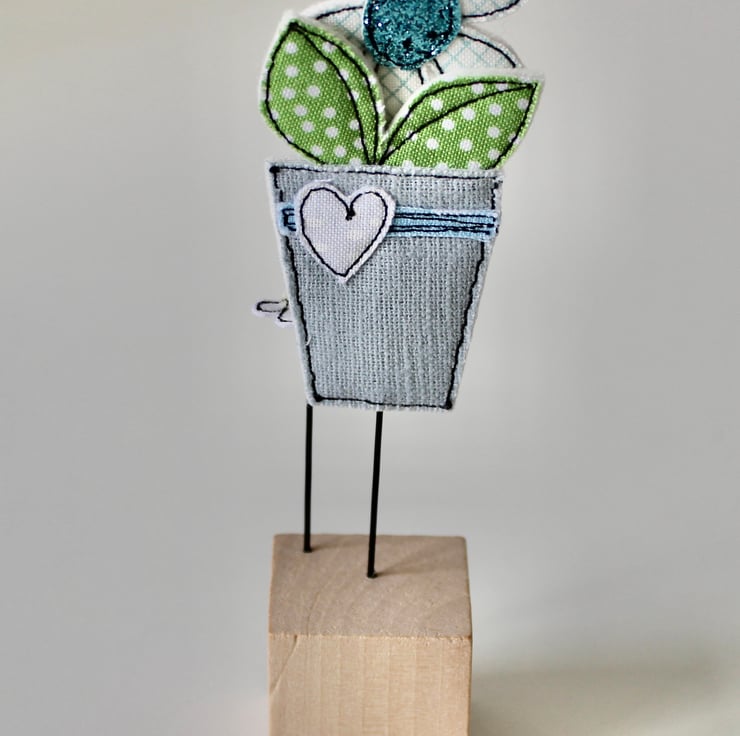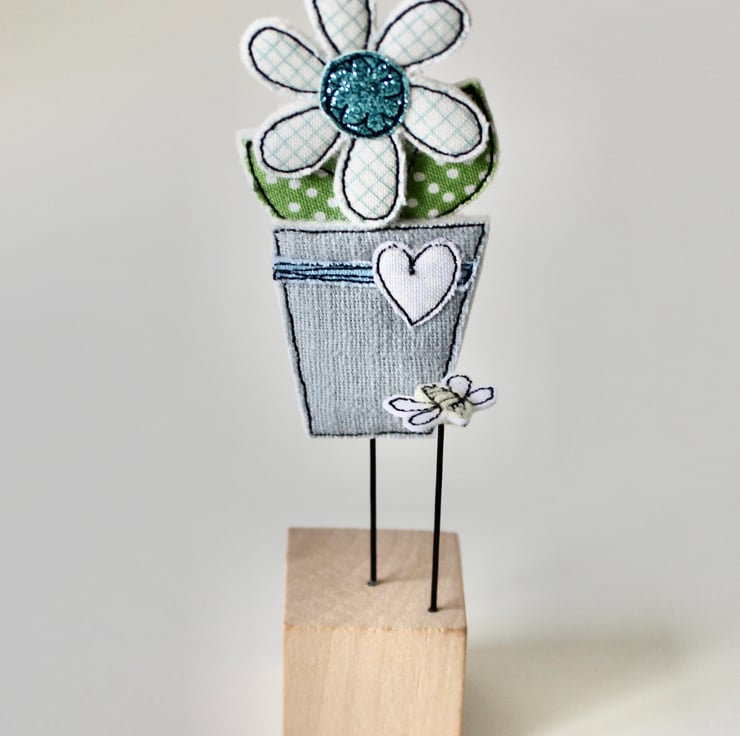 Flowerpot and Bee are created using 100% wool felt, glitter cloth, cotton cloth, free hand machine embroidery and are cut out by hand using very sharp scissors. They are mounted on a 3cm cube wooden block, which can adorn a mantle piece or any flat surface.