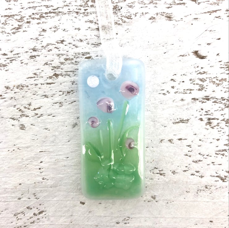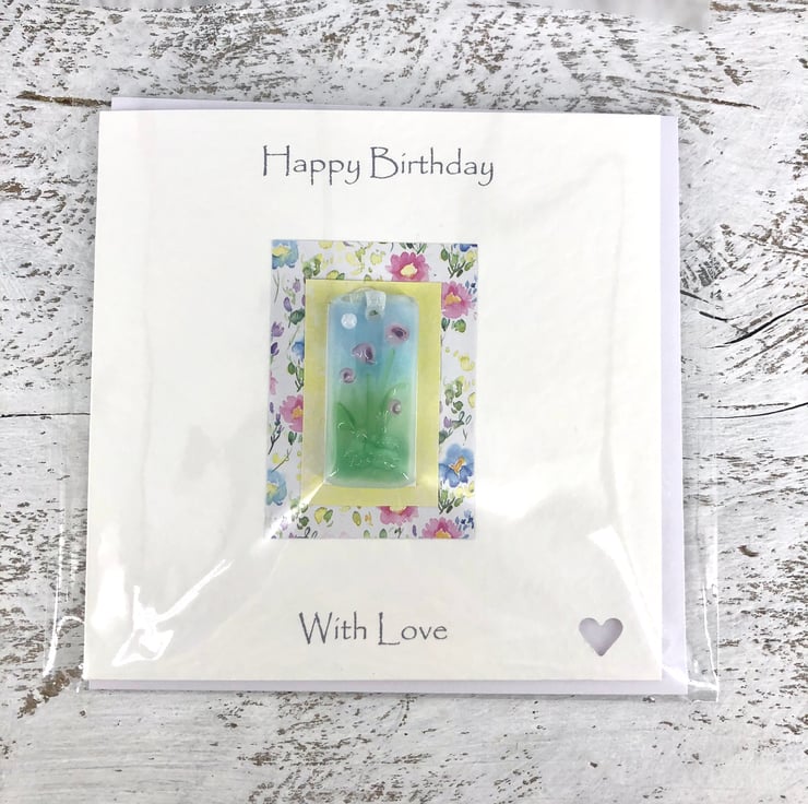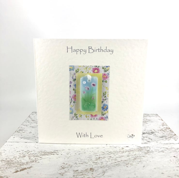 A lovely handmade card with a pretty fused glass hanging with pretty spray of pink flowers on attached to it - the perfect card and gift in one!