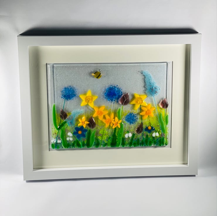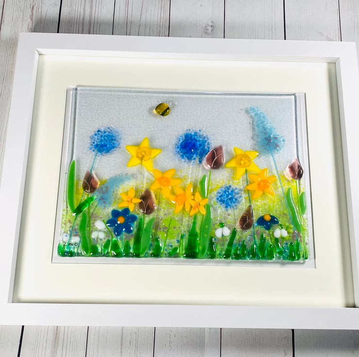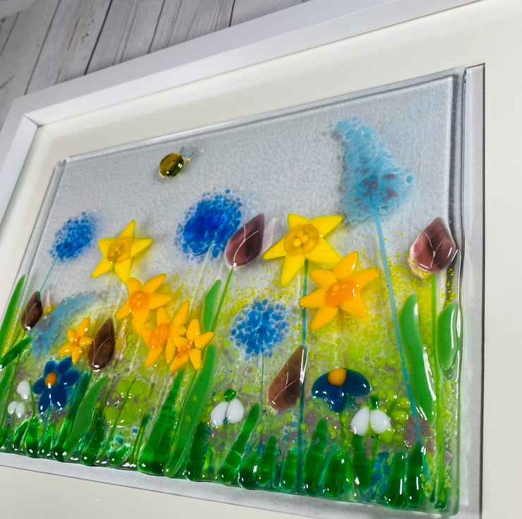 Gorgeous and sunny spring meadow in glass . All hand cut and fused flowers are handmade and formed in my little kiln. The flowers are contoured as well as beautifully vibrant .