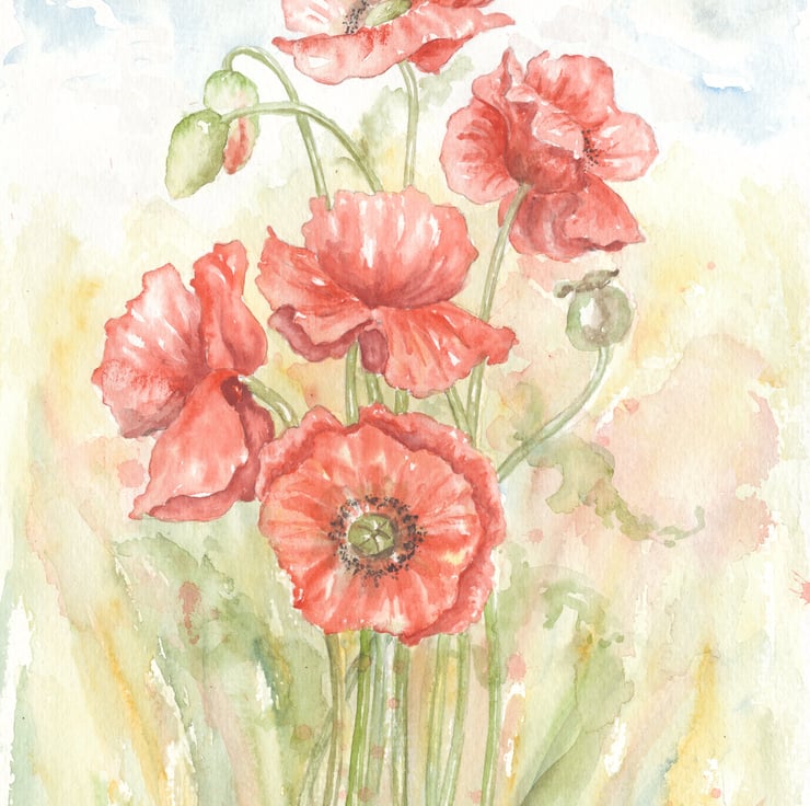 I love painting poppies, I have so many sketches of them over the years. They remind my of cycle rides through the Norfolk country side with my grandad. He knew everything about nature and I adored him. He was in the 1st world war, of course. I can't imagine him there, surviving mustard gas attacks and heaven knows what else. He was such a quiet, gentle and kind man. I always wear my poppy with pride. This painting is for you, grandad, I miss you.