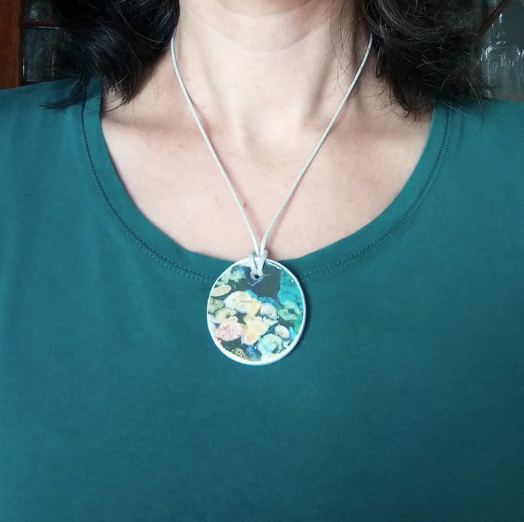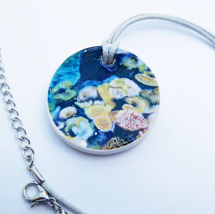 Handmade Coral Reef Art Ceramic Pendant on Light Grey Cord Necklace with Lobster Clasp and Extender Chain