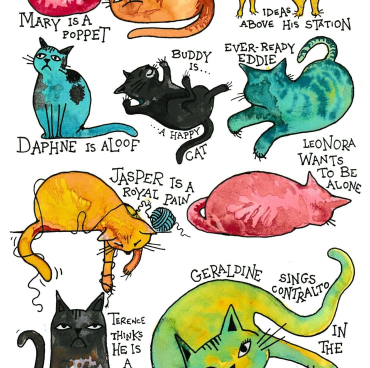 The cat designs are my own personal views on cats, and I know that cat owners will agree with some of the ideas.