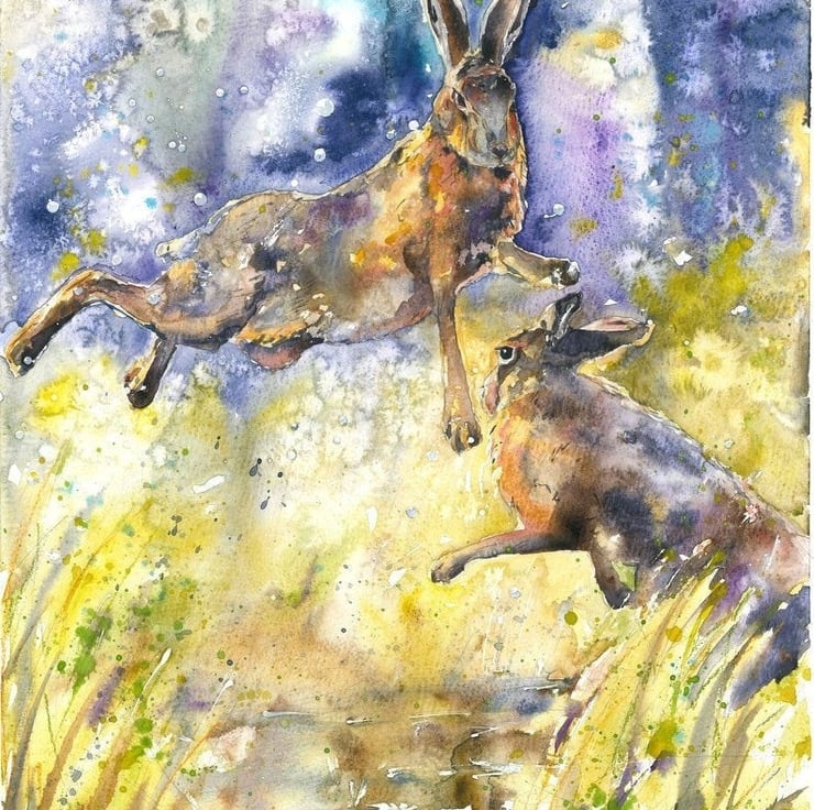 The original artwork of "Boxing Hares" is watercolour, with soft pastel to add highlights and texture