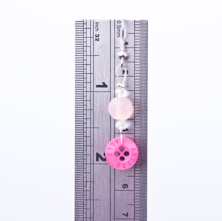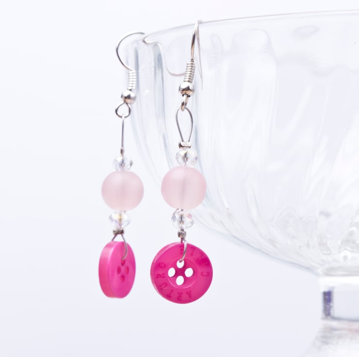 Cute pink buttons with frosted pink beads and clear faceted 'sparkle' glass beads hang from silver plated hooks and are a little under 2inches long (including hooks).