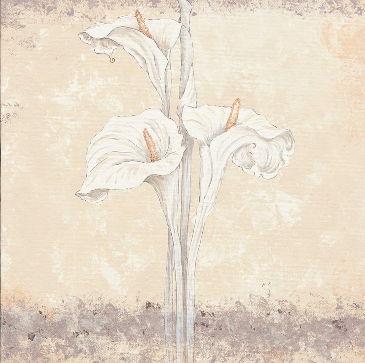 The white calla lilies are on a cream stippled canvas background, the 3 lily stems are accented with golden tones and sepia ink detail. There are stippled bands of sepia and burnt sienna at the top and bottom of the canvas which continues around the sides. I painted this in my Norfolk studio and it is ready to hang. The canvas measures 40.4cm x 30.5cm x 3.5cm. The warm pallet blends in easily and is one of a pair should you need a balanced effect. I call this one 'Sepia Ink Lilies II'.