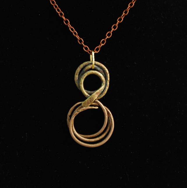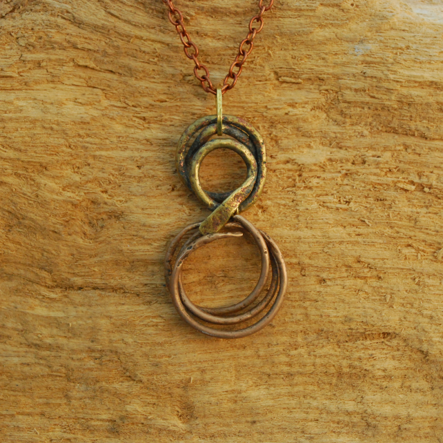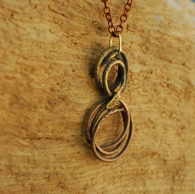 Beach metal is special because of the effect the beating of the waves and the corrosion of the salt water has on the metal. We love the wonderful curving shapes beach metal often has. The two pieces we've used for this amazing pendant were found separately and are two different metals, but fit beautifully together. We've joined the wire shapes so that they create one swirling shape which appears continuous. We've created a hand-beaten brass jump ring to hang the pendant from a copper chain.