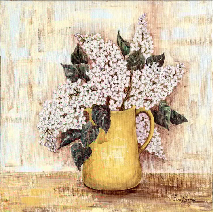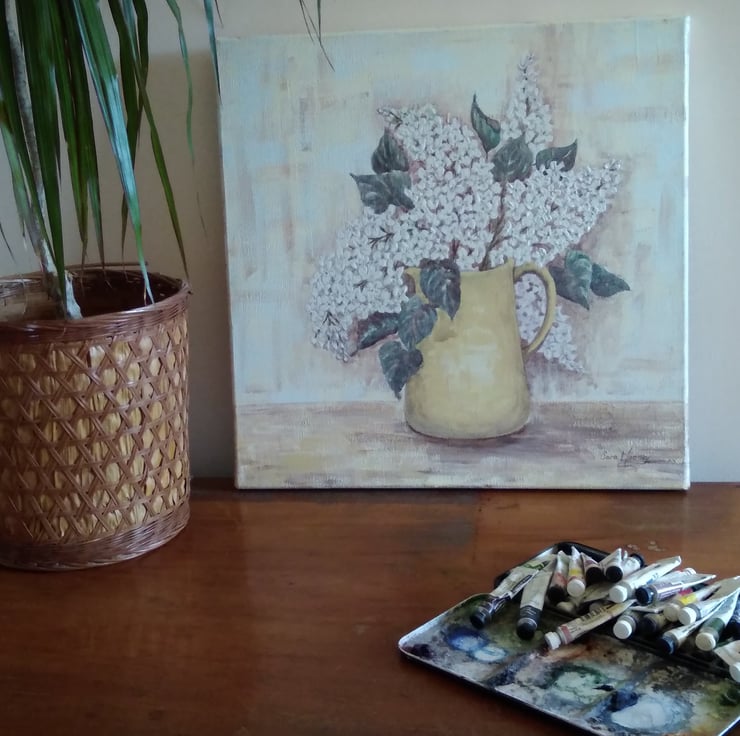 White and pink lilac branches are pouring out of this yellow pottery jug which is sitting on a sun dappled wooden surface. I painted this piece in my Norfolk studio, it measures 40cms sq and is ready for you to hang. The golden tones of the jug are reflected on the wood and the background has a linen like texture painted with cream, blue and golden brown brush strokes which continue around the sides. This painting has a comfy, homely feel to it. Would it work in your home or could it make a pleasing new home gift? I call this one 'Lilac in Yellow Jug II'.