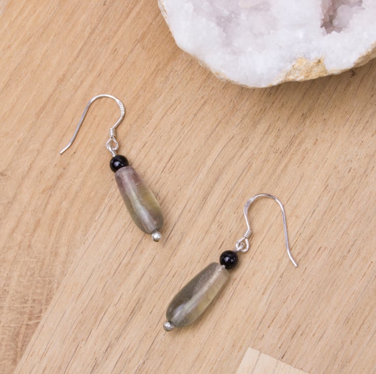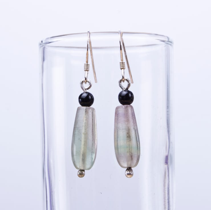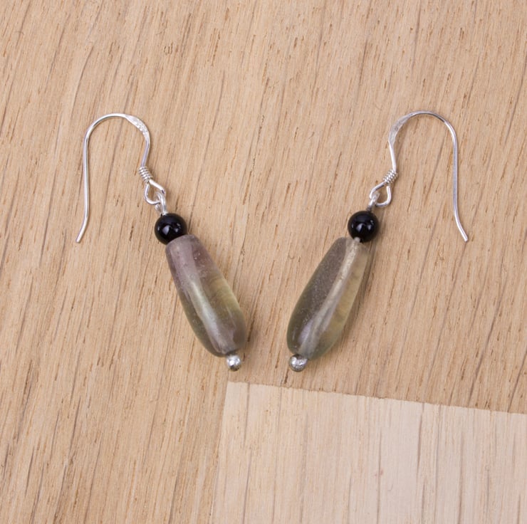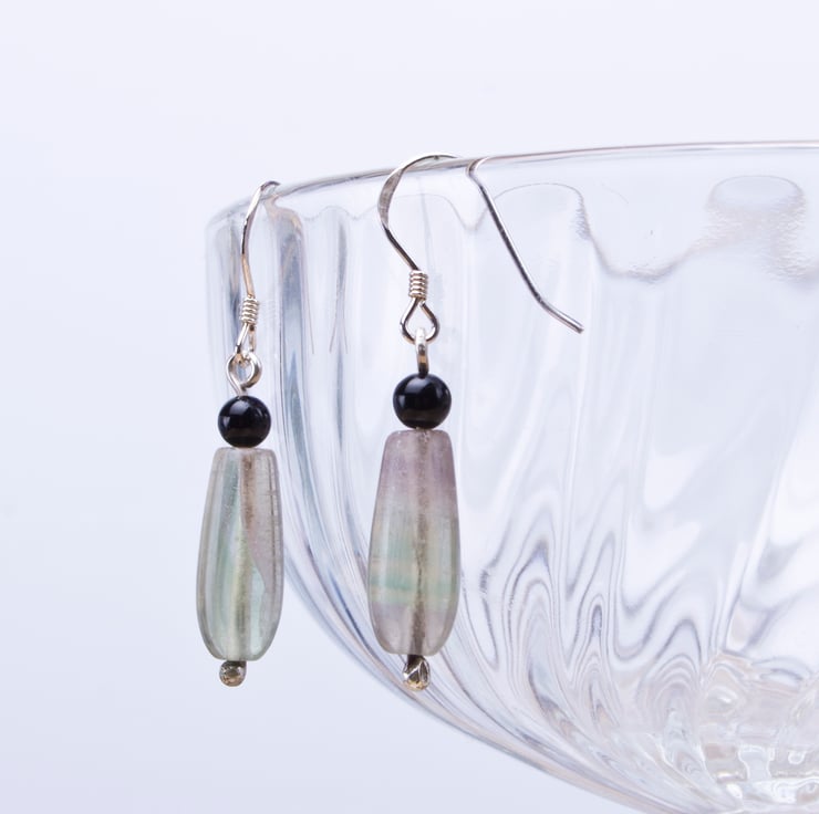 Fluorite drop and black onyx gemstone sterling silver earrings