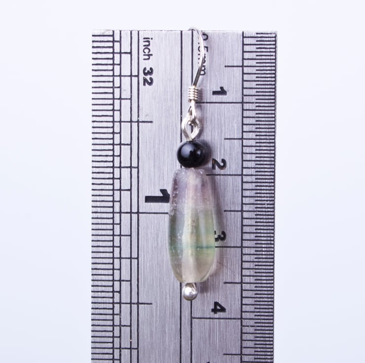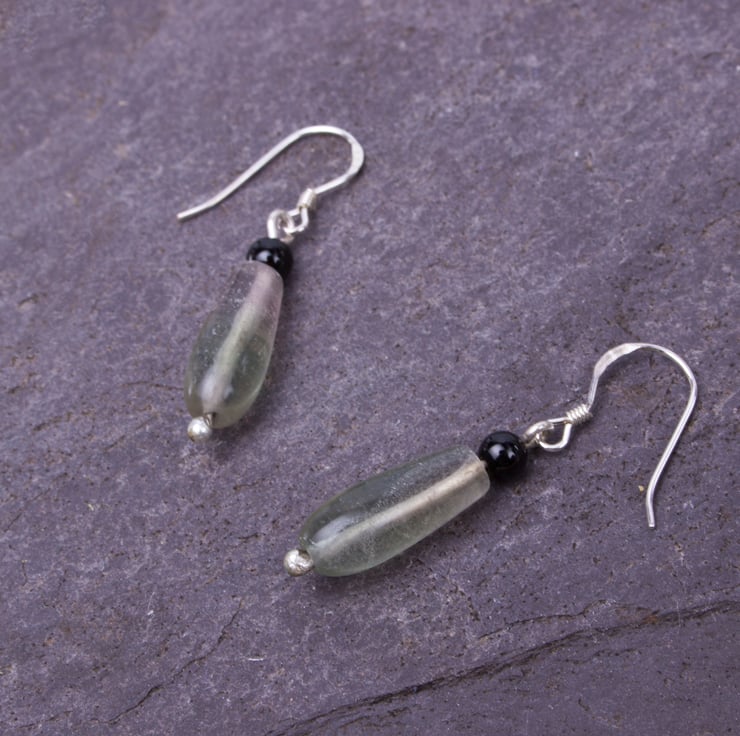 Beautiful fluorite smooth teardrop shaped gemstones with round black onyx beads hang from sterling silver ear wires. Subtle pink/purple hues can be seen in the green fluorite drops. These gorgeous earrings are a little over 3.5cm long including the ear wire. Earwires are stamped 925.
