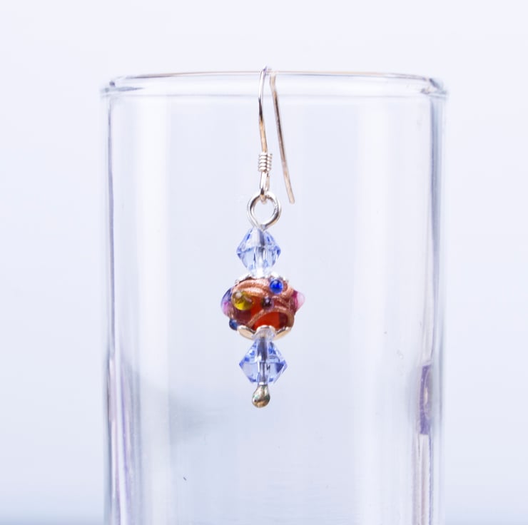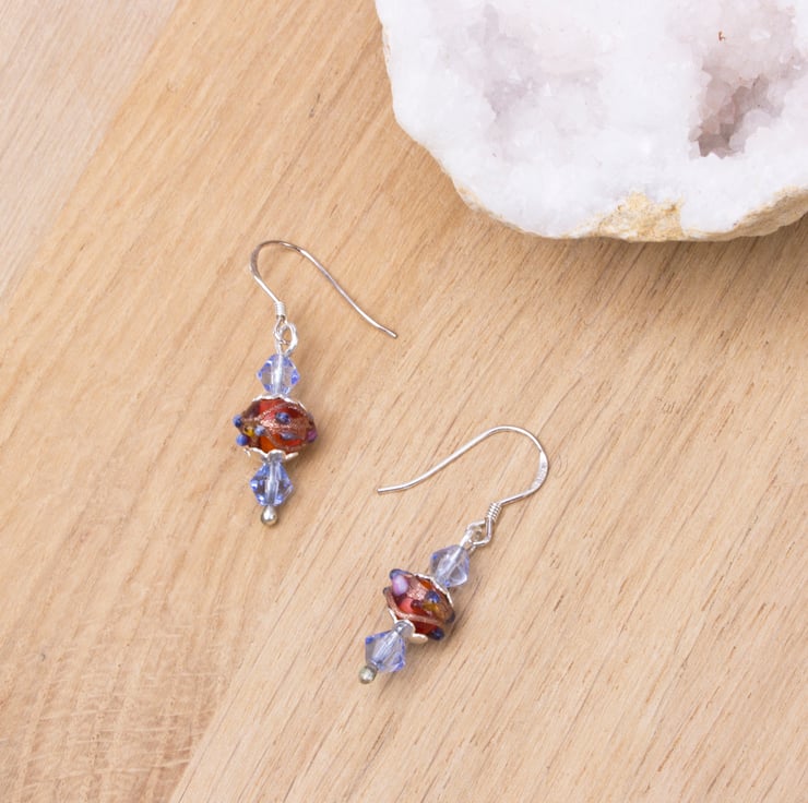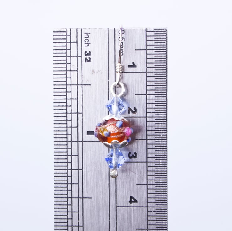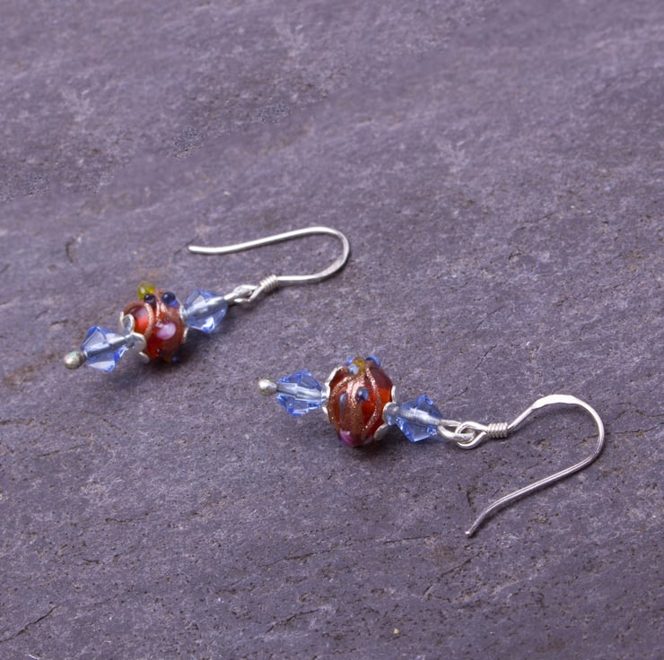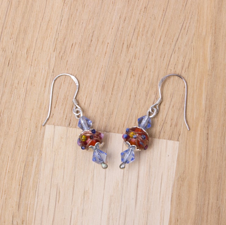 Handmade red glass Indian lampwork beads are combined with sterling silver flower caps and blue bicone beads. Almost 3.5cm long including the sterling silver ear hooks. Earwires are stamped 925.