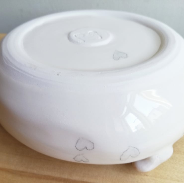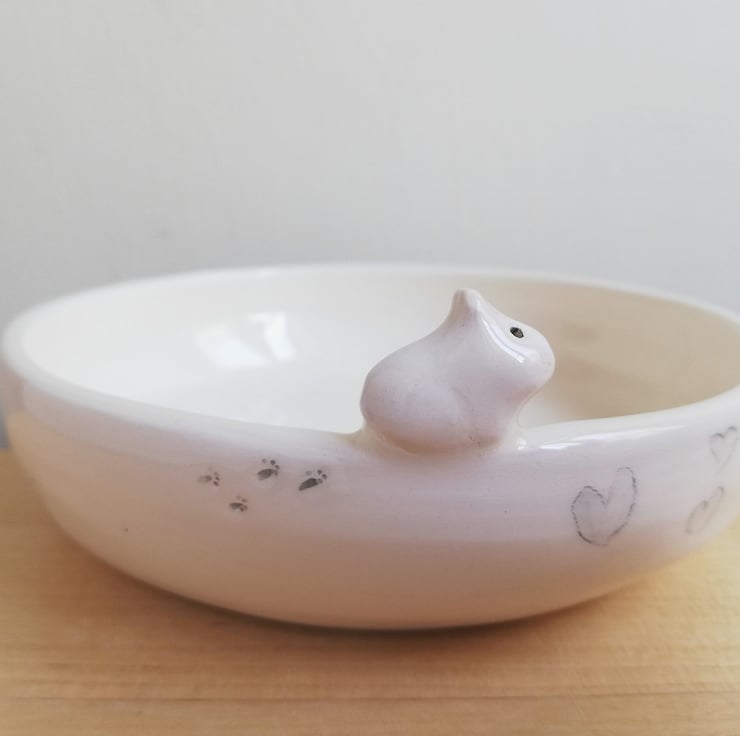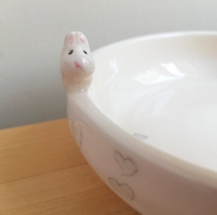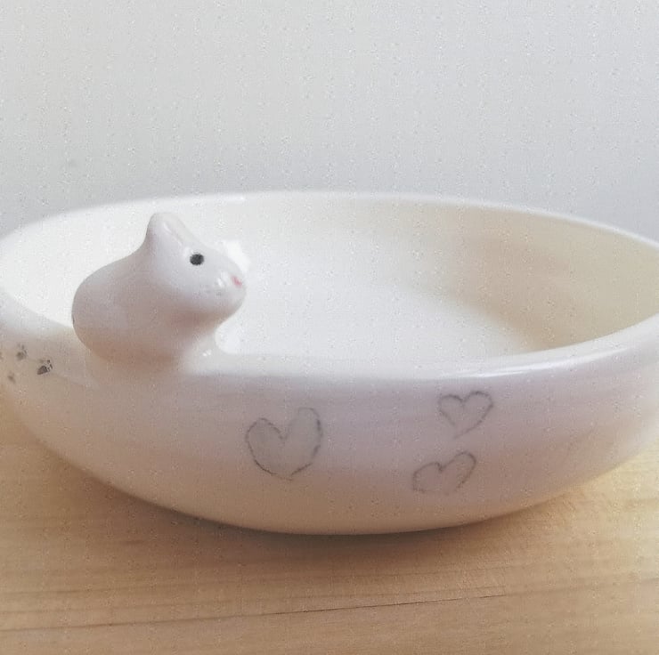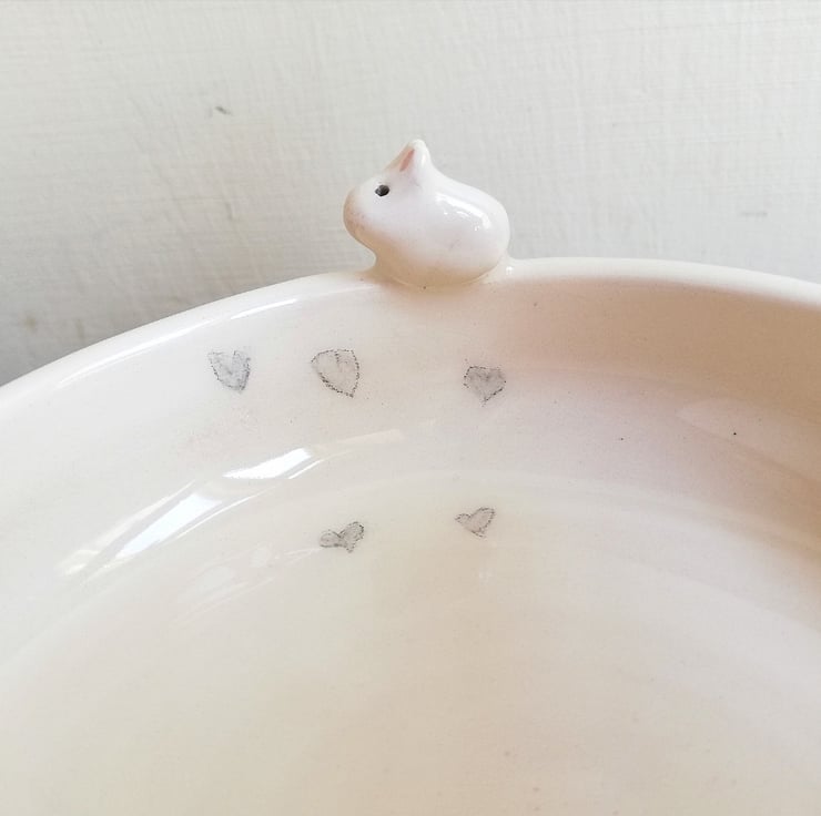 Handmade pottery rabbit bowl with little handpainted hearts and modelled white rabbit and pawprints. There is a little grey heart on the base of the bowl. Ideal as rabbit feeder or trinket bowl.