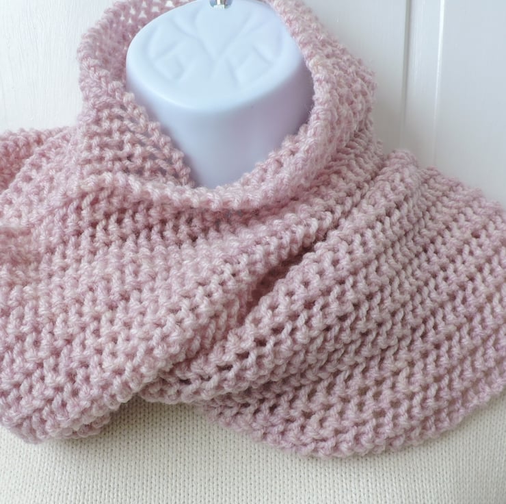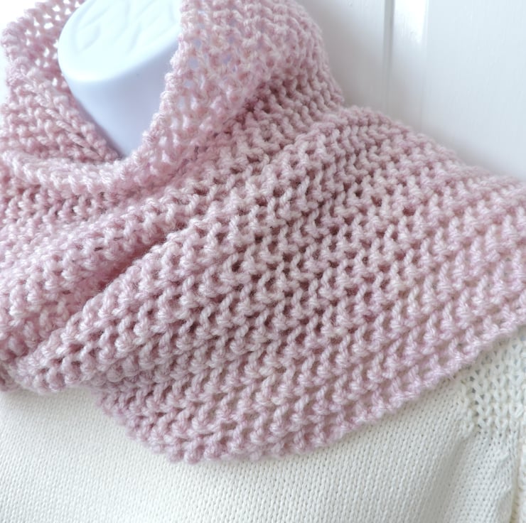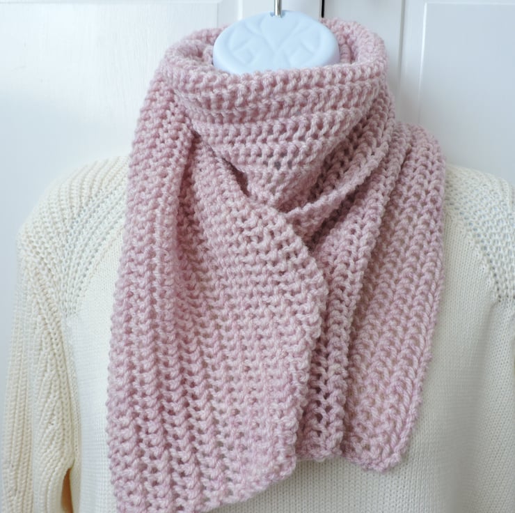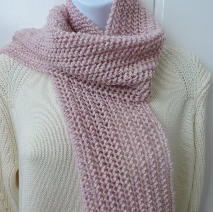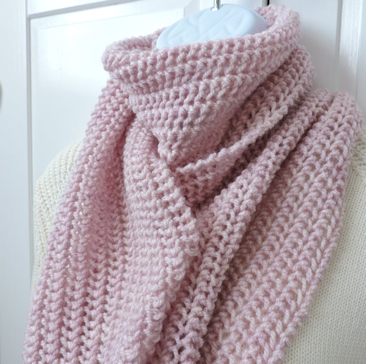 I've knitted this scarf in a lovely soft premium 100% acrylic yarn. A pretty open knit pattern which gives the scarf suppleness. The colour is a soft pastel pink.