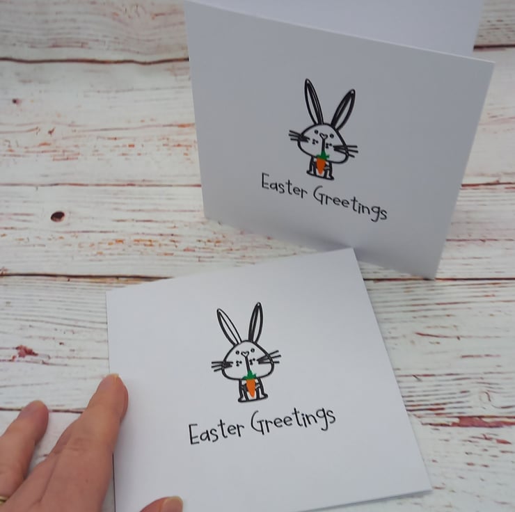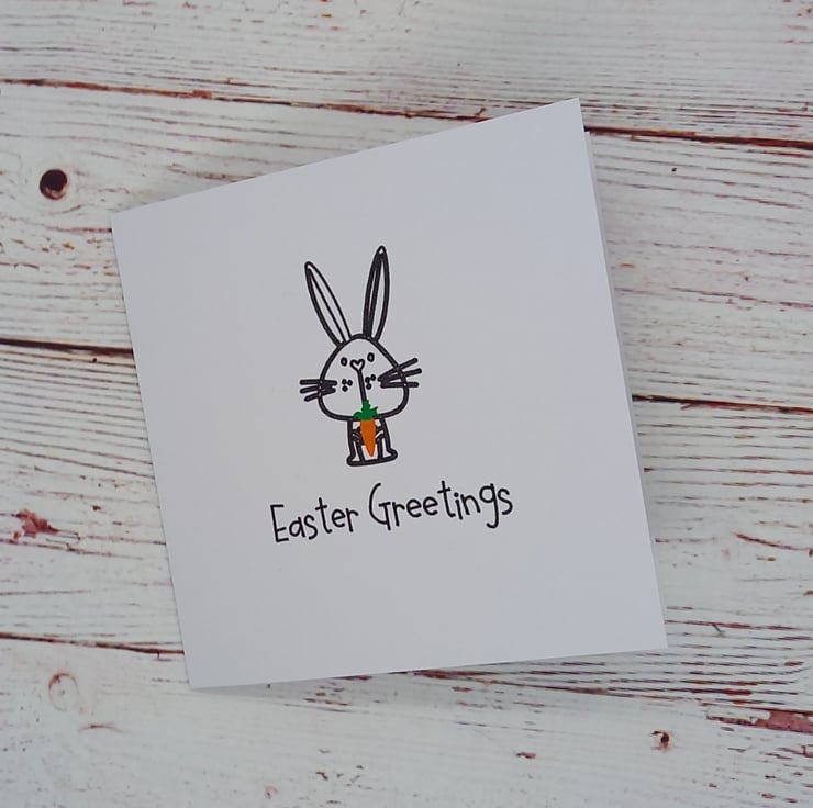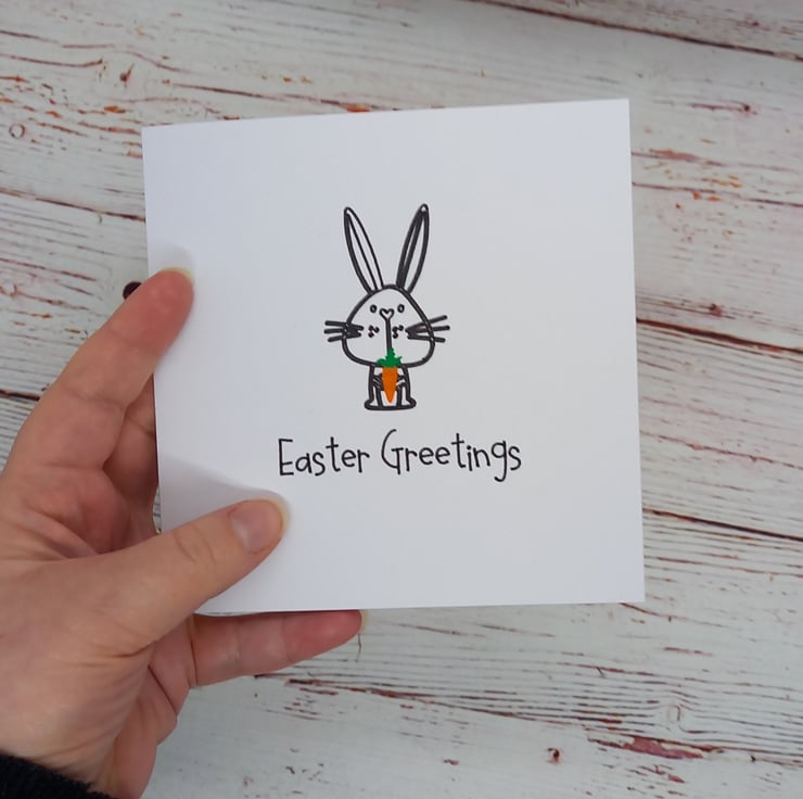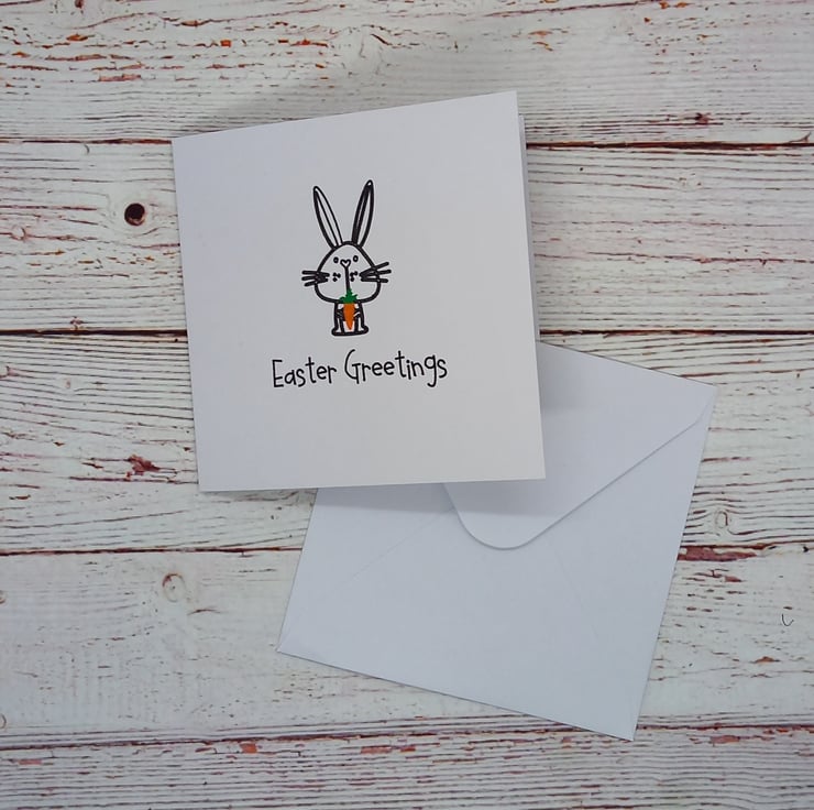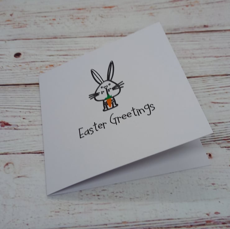 Featuring a cute cartoon rabbit holding a carrot and the words 'Easter Greetings' the card has been left blank inside for your own message