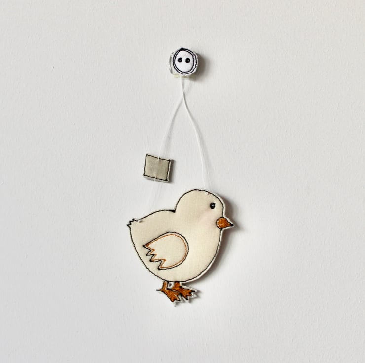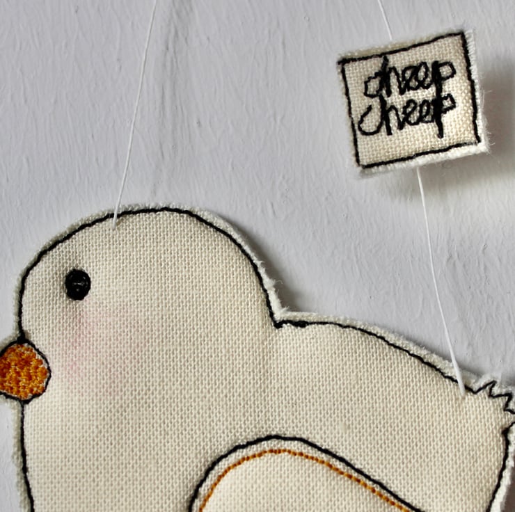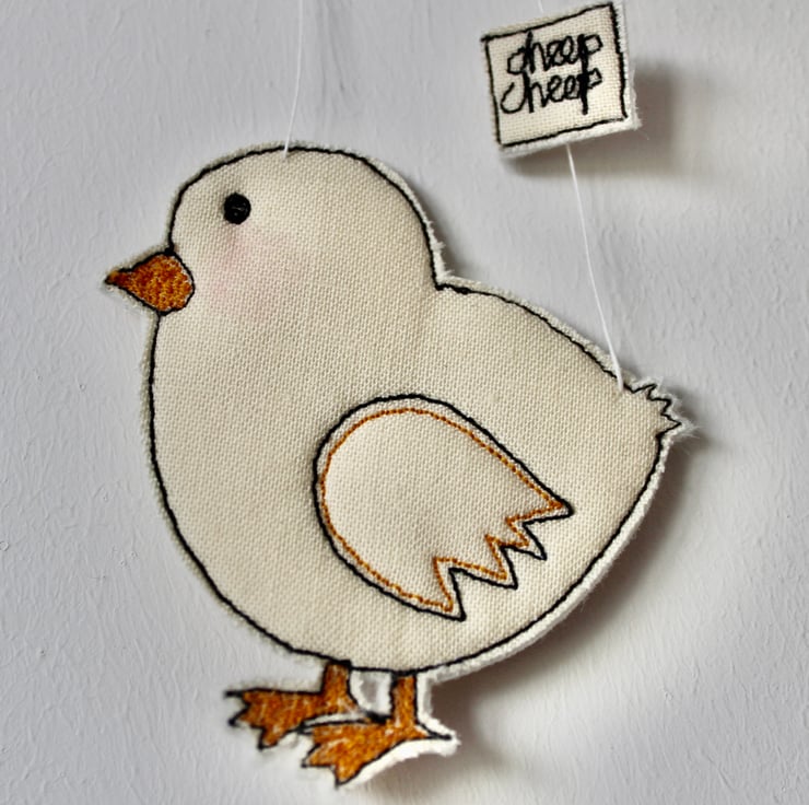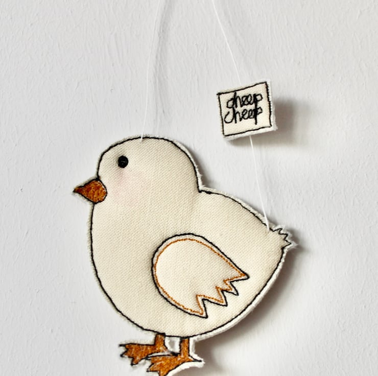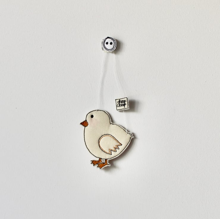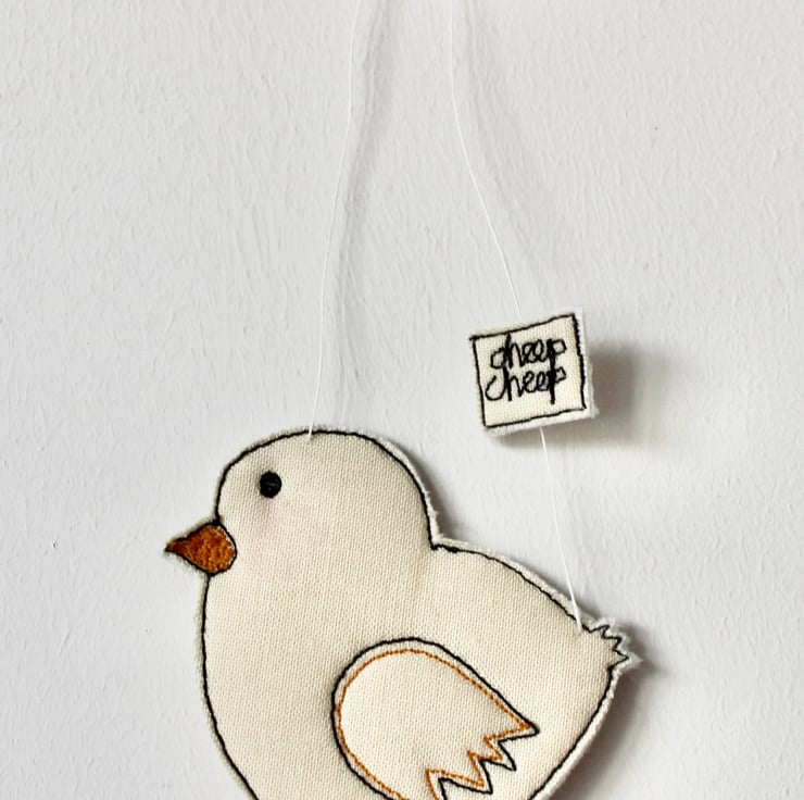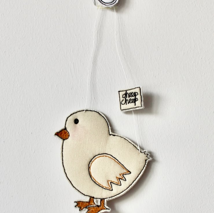 Chicks are sewn using 100% wool felt, cotton cloth and free hand machine embroidery; multiple layers of cloth are sewn together and cut out by hand using sharp scissors. With a linen string to suspend.