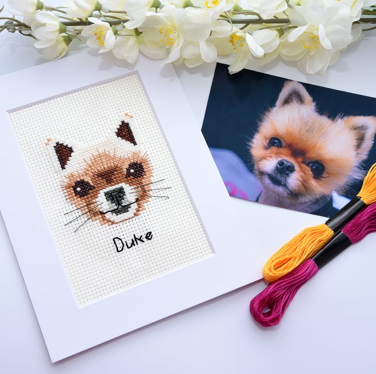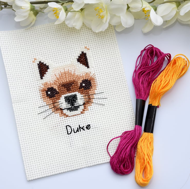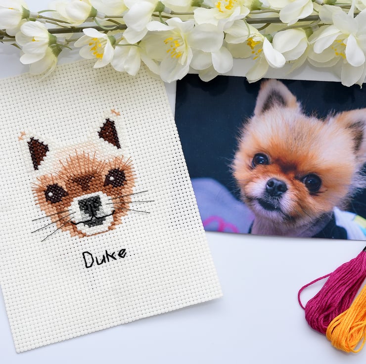Grace the walls of your home with a custom-made, cross stitch, pixel pet portrait!