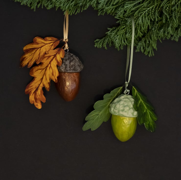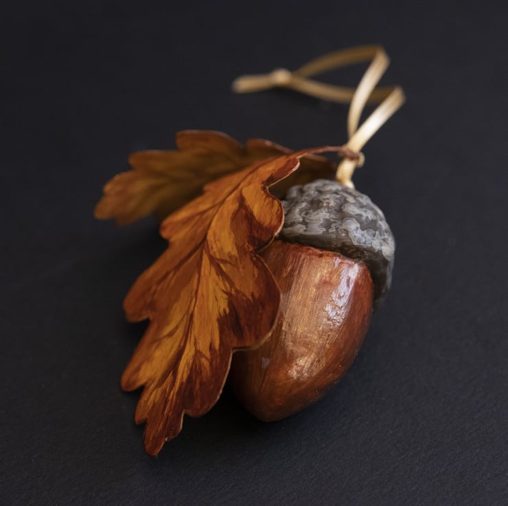 These lovely delicate hanging acorn decorations are made using a mixture of a traditional moulded paper pulp papermache technique with wired card leaves, each one individually handpainted and completely unique. They are finished with varnish for longevity and hang on a gold satin ribbon.