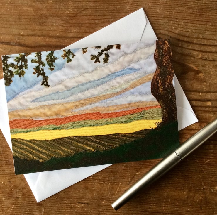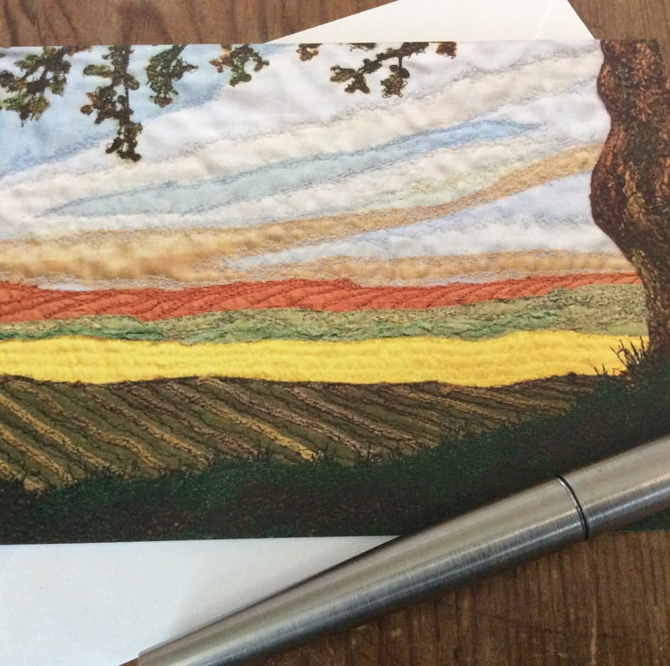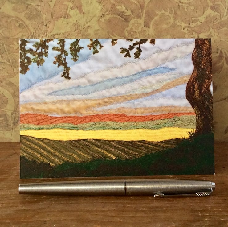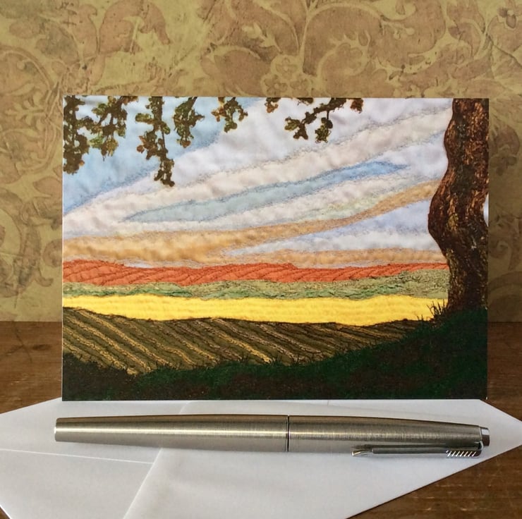 This card is a print of one of my free motion embroidered landscapes. It shows the sun setting over the ploughed fields of the Cotswolds from the shade of a tree. It’s blank inside making it ideal for any occasion. The card measures 10.6 x 15cm and it comes with an envelop in a plastic cover for protection.