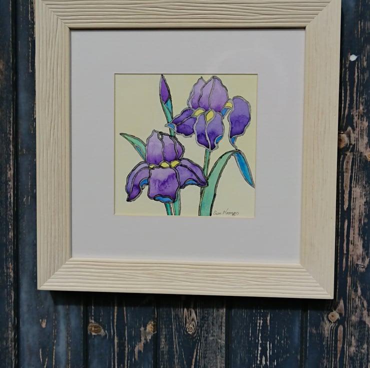 Purple iris painting features 2 iris heads, leaves and a bud.Each section of the flower is separated with a thick watercolour pencil line which resembles a stained glass effect. The leaves are emerald green and blue with a pop of lemon/yellow on the irises. The cream background is plain and the eye is focused one the subject. I painted this in my Norfolk studio, it is mounted, elegantly framed in lime-washed wood and ready for you to hang. The painting measures 34cm square totally with the internal image at 16cm square. I call this one 'Stained Glass Iris