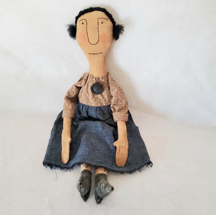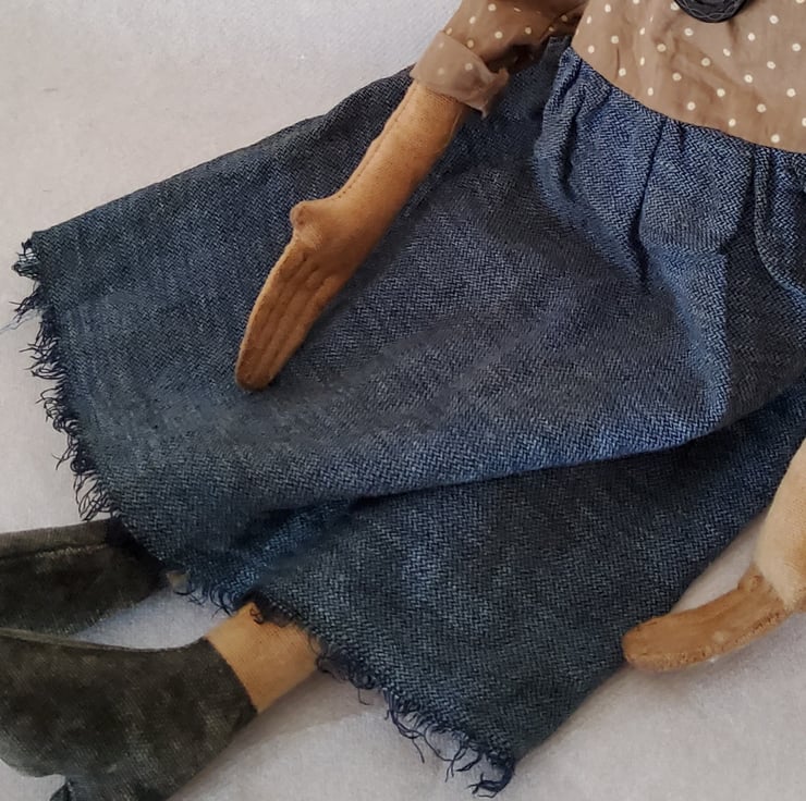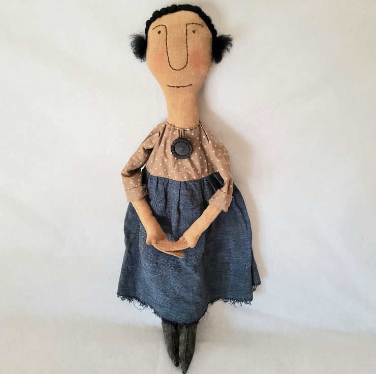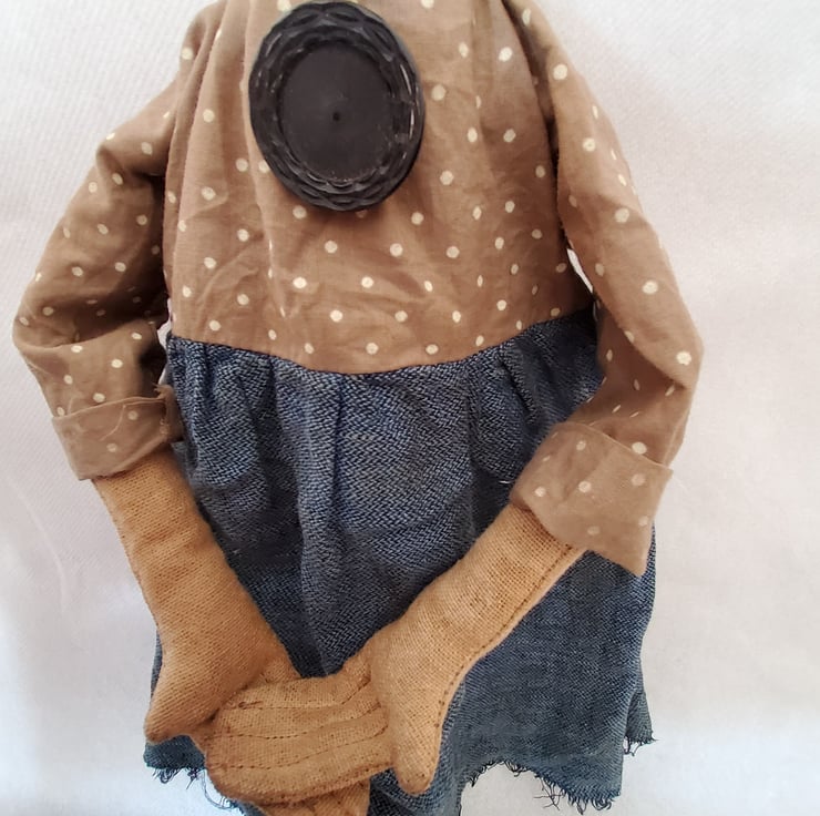 This primitive lady has been made from Osnaburg fabric ,coffee and cinnamon dyed and then given a good old sanding.