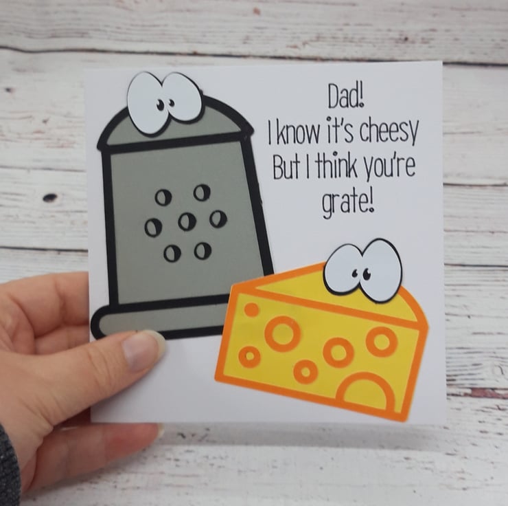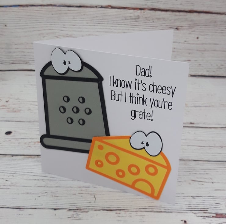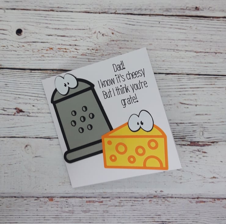 Featuring a cartoon block of cheese and a cheese grater, this fun card declares 'Dad! I know it's cheesy but I think you're grate'