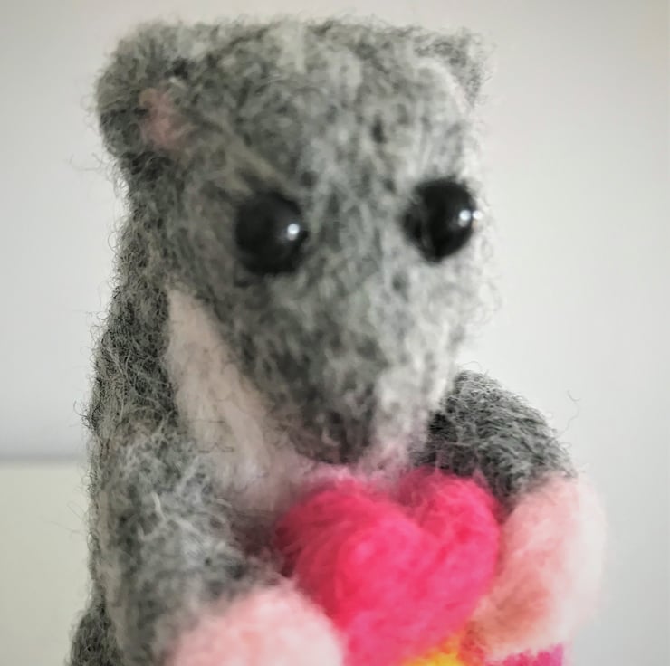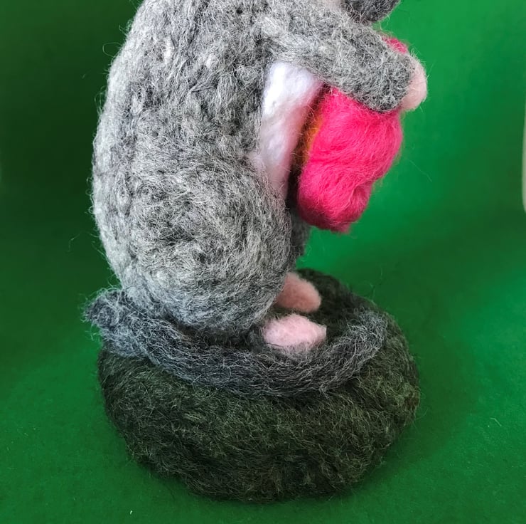 Little grey mouse , 13 cm high with the biggest pink flower she could find . Needle felted onto a felted base.