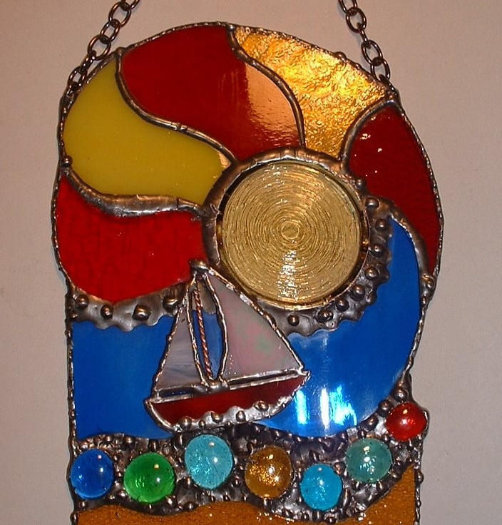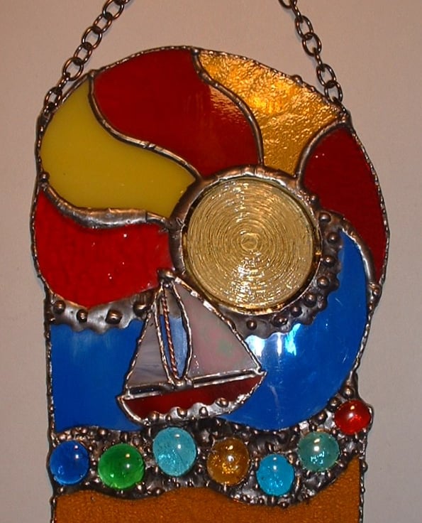 A beautiful unique design depicting a summers day at the seaside with a sailing boat bobbing along on the waves with a psychedelic sun in the background. Created using a mixture of new and antique glass in blue, yellow, orange and red with glass nuggets.