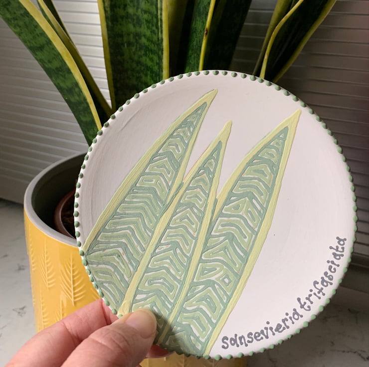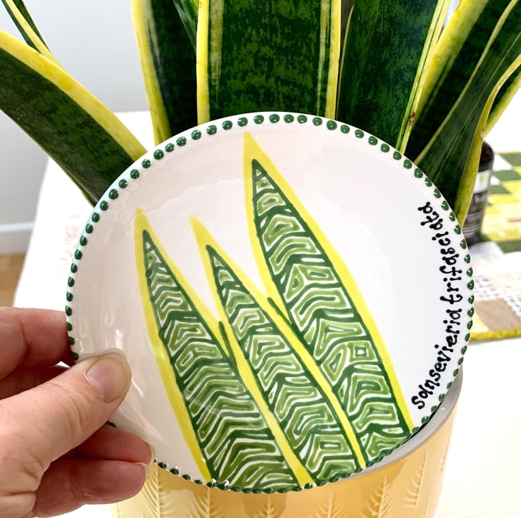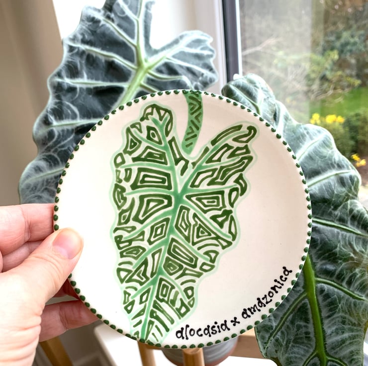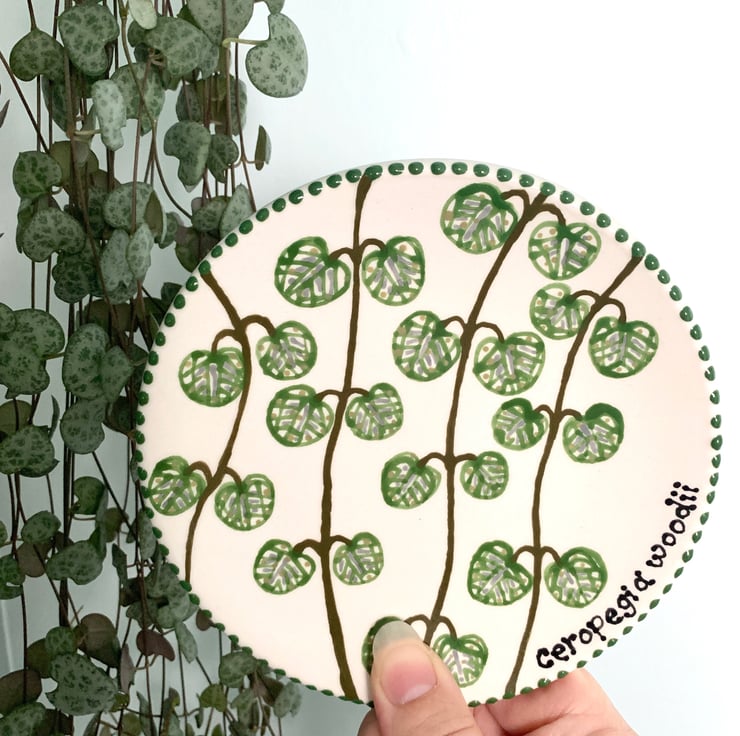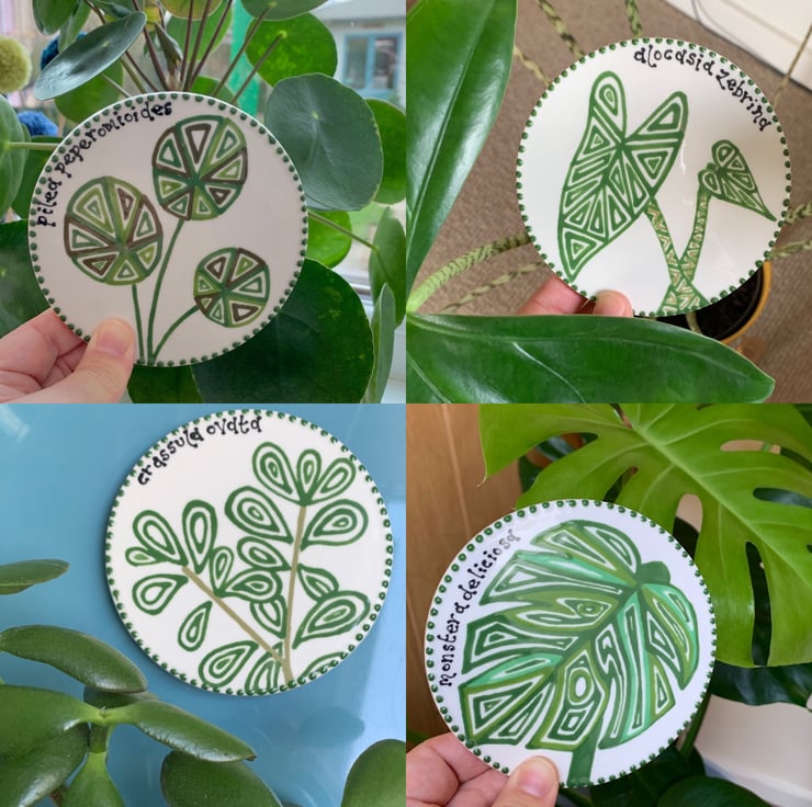 Individually hand painted in a geometric design, each plate represents a well loved house plant. A row of 3D coloured dots around the rim adds the final flourish. The botanical Latin plant name is handwritten around the edge as a nod to Darwin’s style of recording plants.