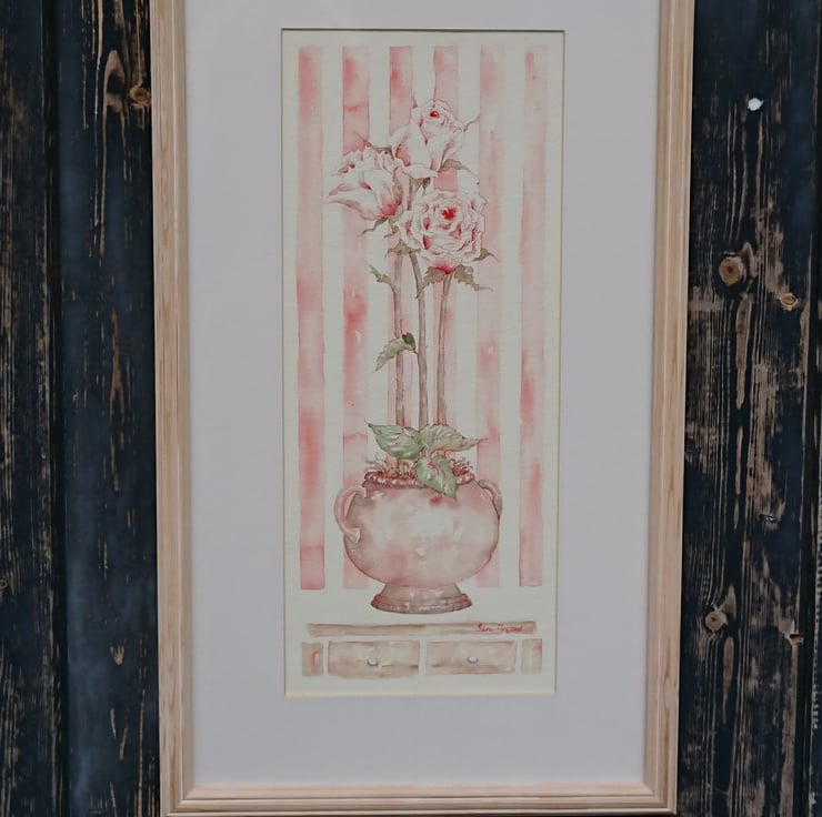 Pink rose buds features 3 long stems with leaves in a dusky pink shabby chic 2 handled pot. The background has faded pink stripes and there is a stylised drawer front at the base of the painting. I created this one in my Norfolk studio and it is mounted, elegantly framed in lime-washed wood and ready for you to hang. The overall measurement is 53cm x 30cms and the internal image is 38cm x 15.5cm. I like the parred down feel to this one with ink detail and it is a series of 3. I call this one 'Scandi Rose I'.