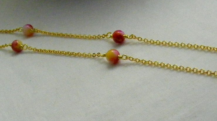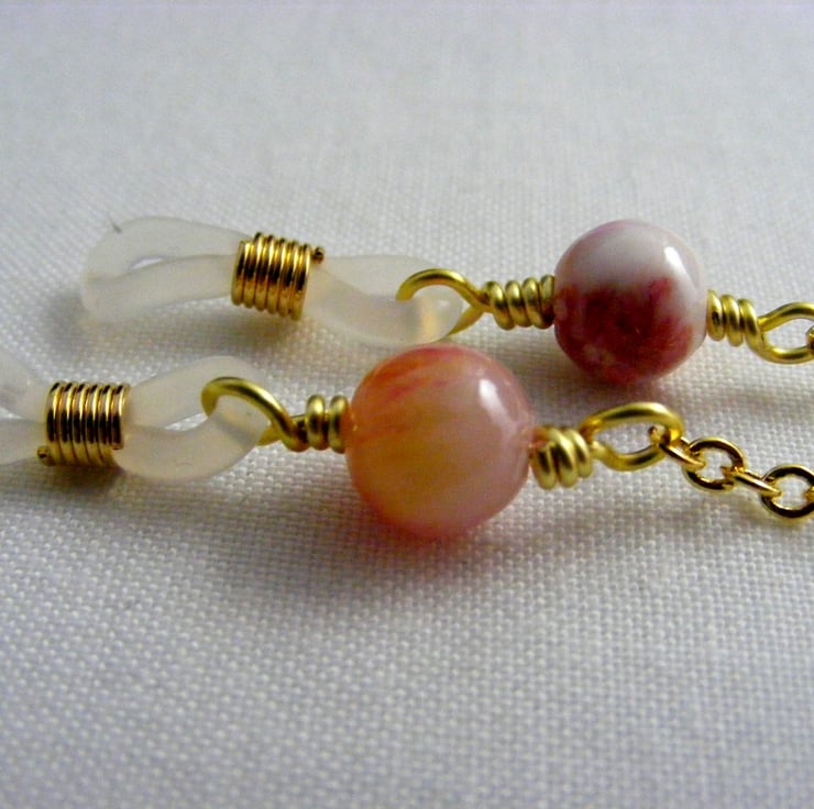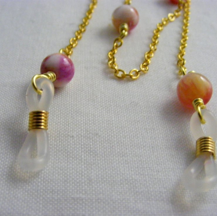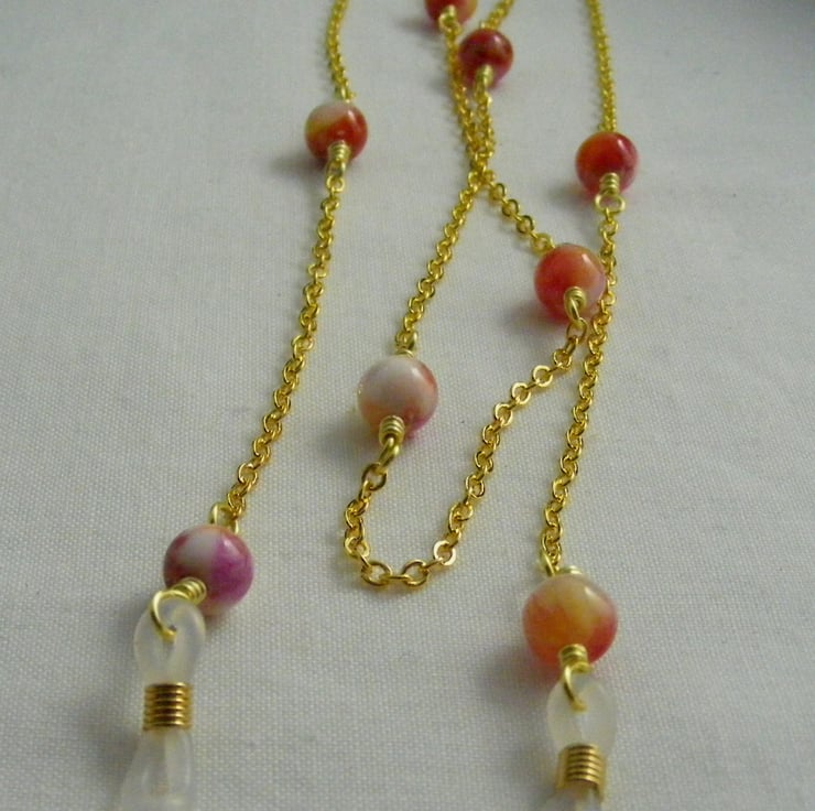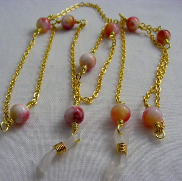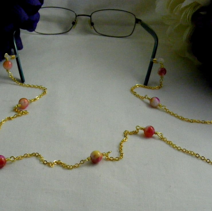 I've handmade this pretty glasses chain using, 8 mm rose jade round gemstones, gold plated wire, gold plated oval link chain and spec findings.