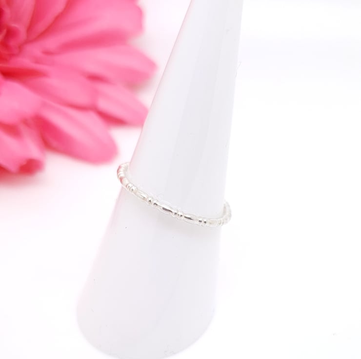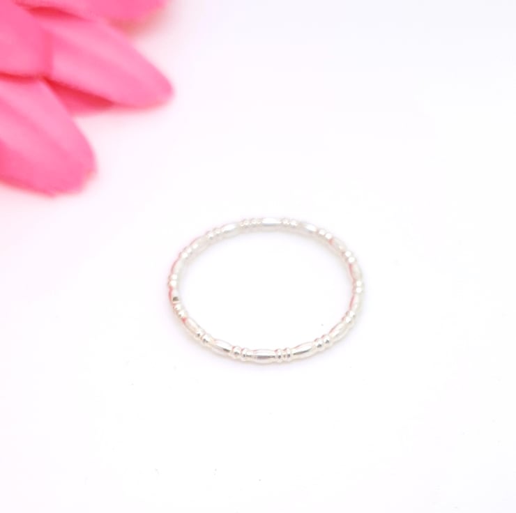 This dainty sterling silver band ring is the perfect complement to any of our gemstone set stacking rings. The beaded band is very tactile and comfortable to wear. On it's own this band makes for a pretty and understated piece. This ring has been highly polished but could be created in a satin or brushed finish if desired. The band measures approximately 1.5mm wide.
