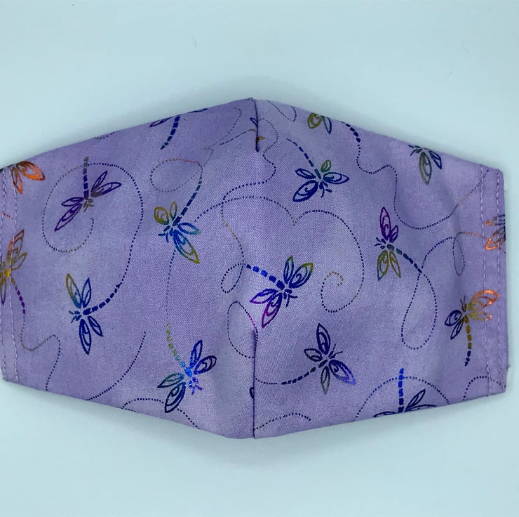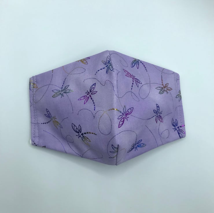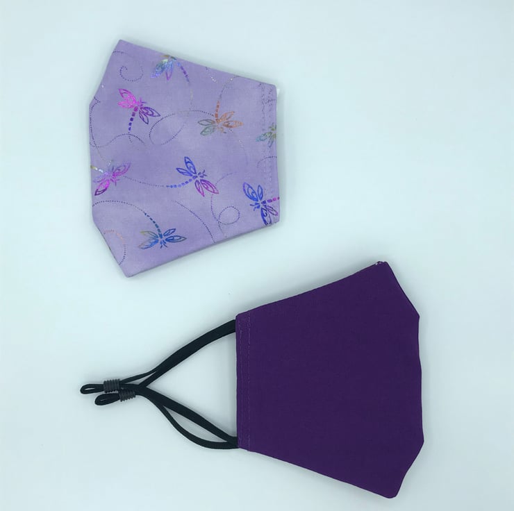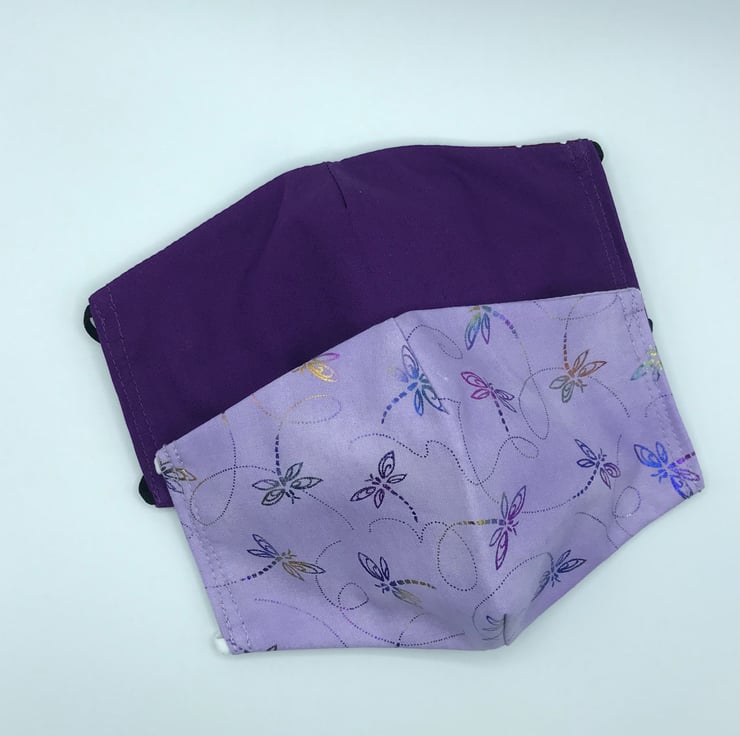 These beautiful spring / summer themed masks have been handmade using three layers of 100% cotton fabric with multicoloured metallic Dragonfly print on one side and a choice of purple or lilac for the reverse plain side.