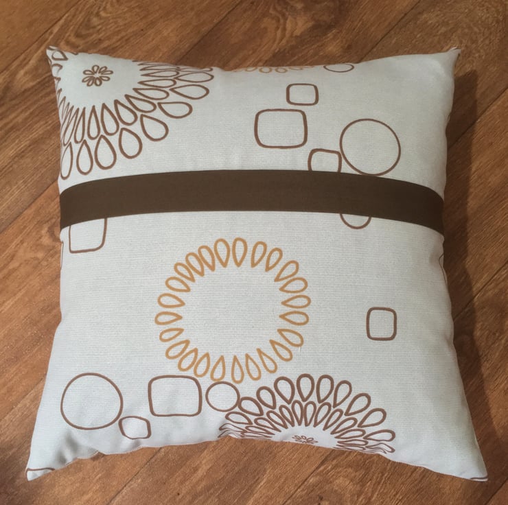 The cushion cover is backed with a pale duck egg blue and brown upholstery fabric. The cover has a zip at the back which is hidden under a dark brown flap.