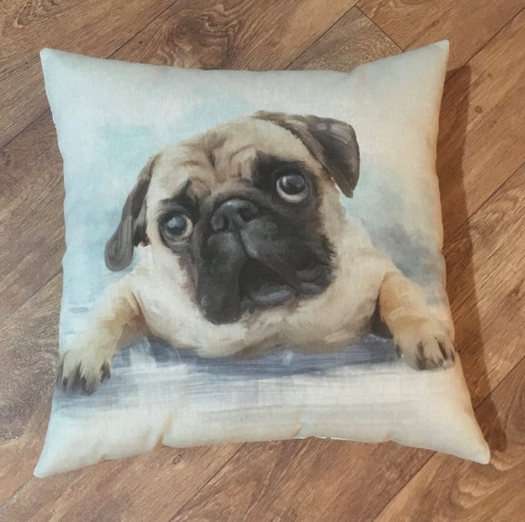 A lovely cushion cover made from a cotton rich linen front featuring an adorable pug with irresistible puppy dog eyes.