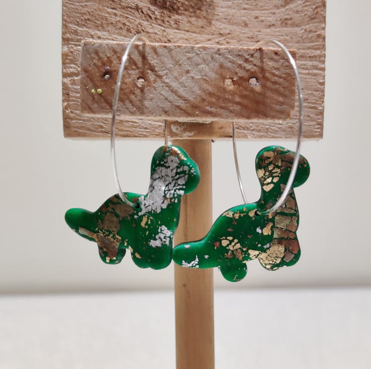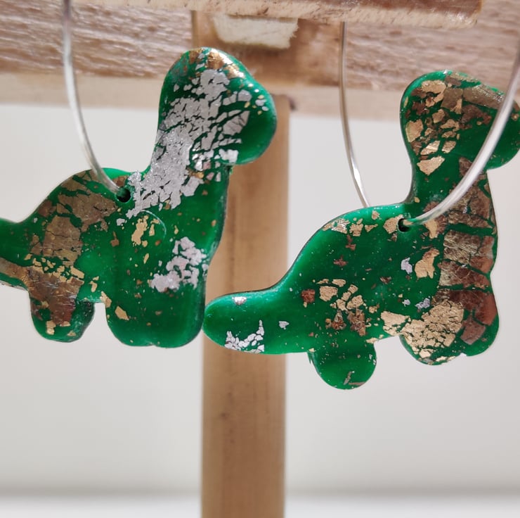 Hand made polymer clay earrings with an abstract pattern shaped as a dinosaur with gold flakes of various tones threaded through a large silver coloured hoop. medium sized. Please see all photos for close up detail. All products handmade therefore there may be minor imperfections. Each pair sold as seen, message for more info