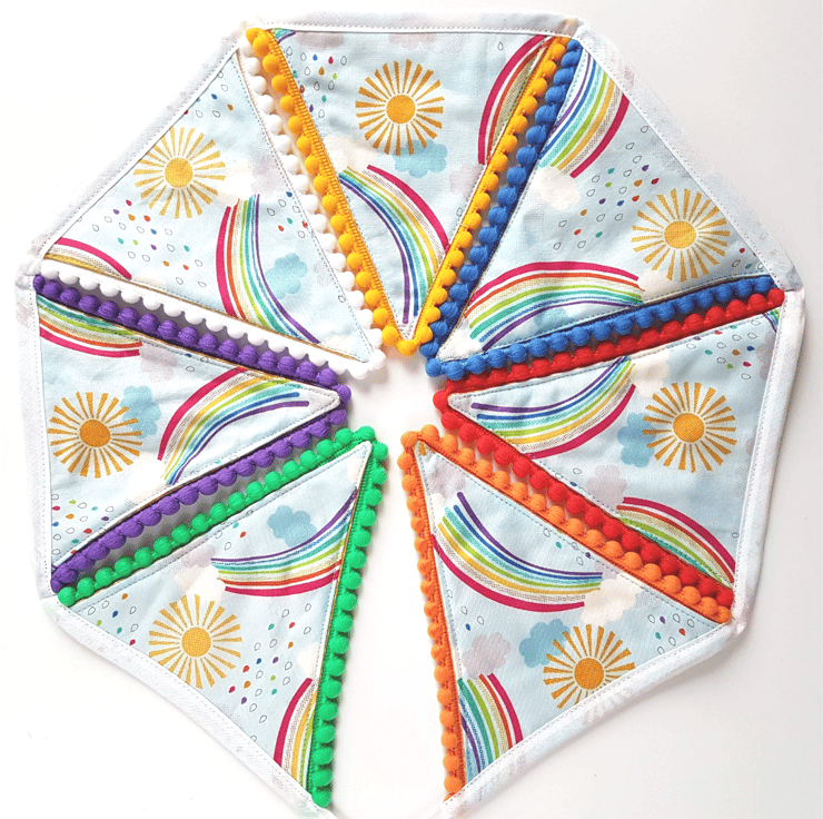 The 7 double sided flags with the back being a plain self-coloured fabric is reversible making the bunting very versatile. Each flag is finished with a pom pom trim and is neatly sewn into a white binding with generous ties at each end of the bunting.