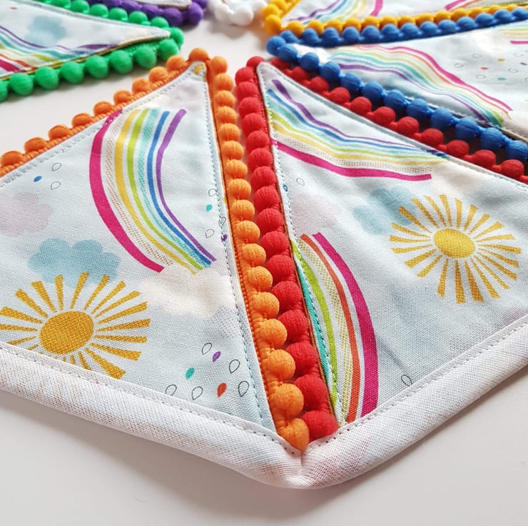 This lovely handmade bunting with it's beautiful and vibrant sunshine and rainbows print quality fabric would make the perfect addition to a child's bedroom, nursey or playroom.