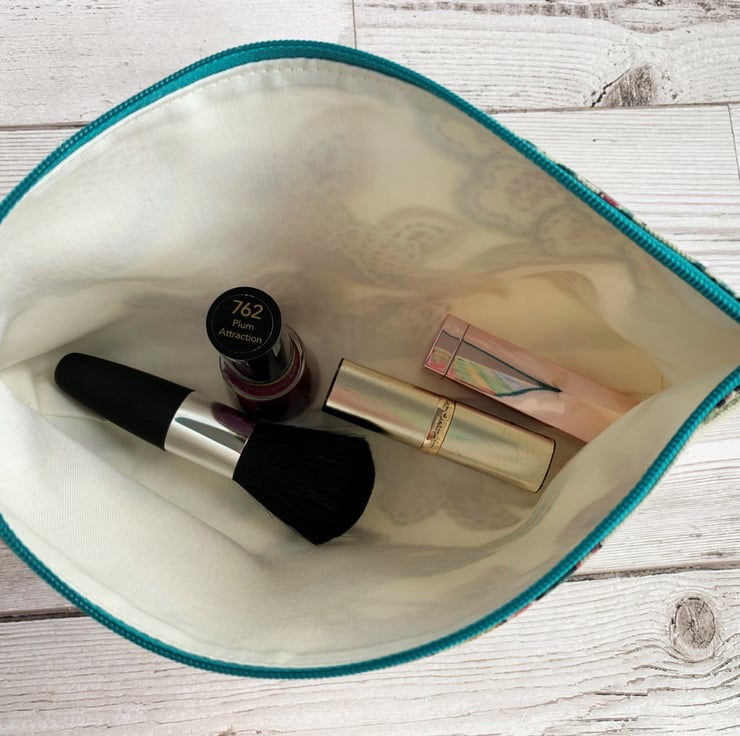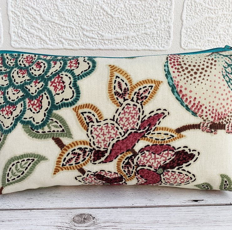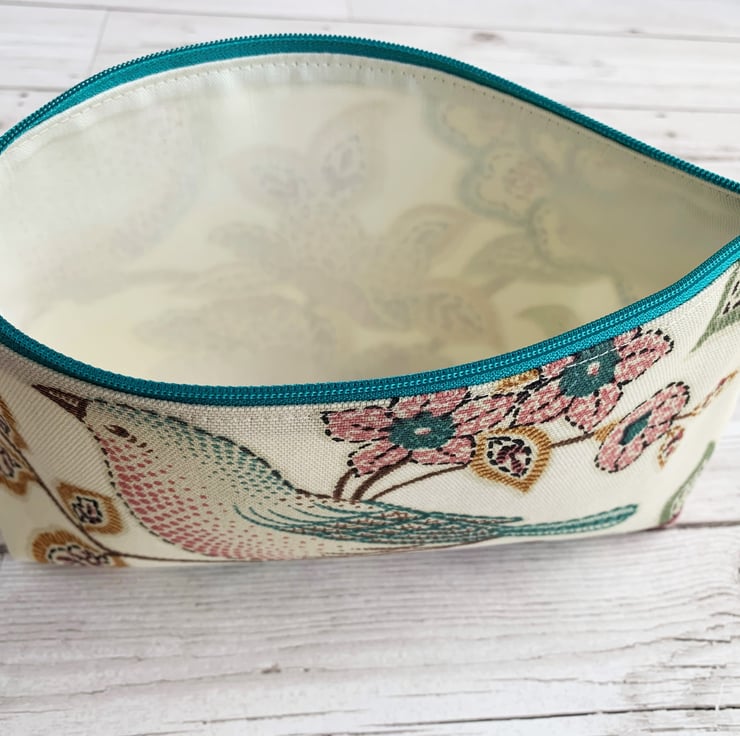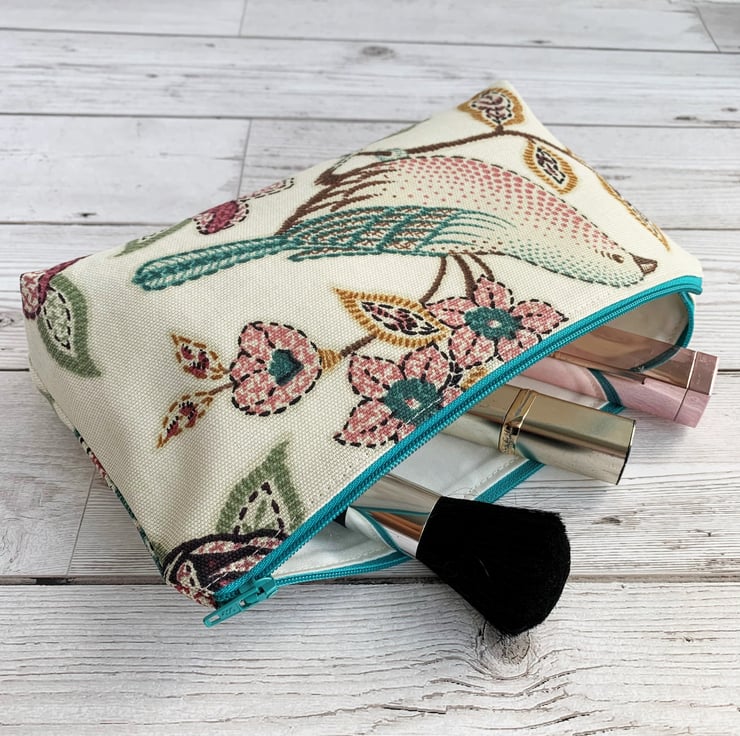 A stylised bird and flowers make up bag. This handy cosmetic bag is made from a delightful print fabric with a stylised bird and flowers pattern. The pattern depicts a bird amongst leafy and floral branches. The colours are shades of turquoise, dusky pink, magenta, golden yellow, brown, pale green and black on a cream background. Much of the pattern is made up of crosses, dashes and dots to give the impression of a stitched design, which gives a folk art feel to the scene. The make up bag fastens with a matching turquoise zip and is lined with cream fabric. The base of the bag is boxed giving lots of room inside.
