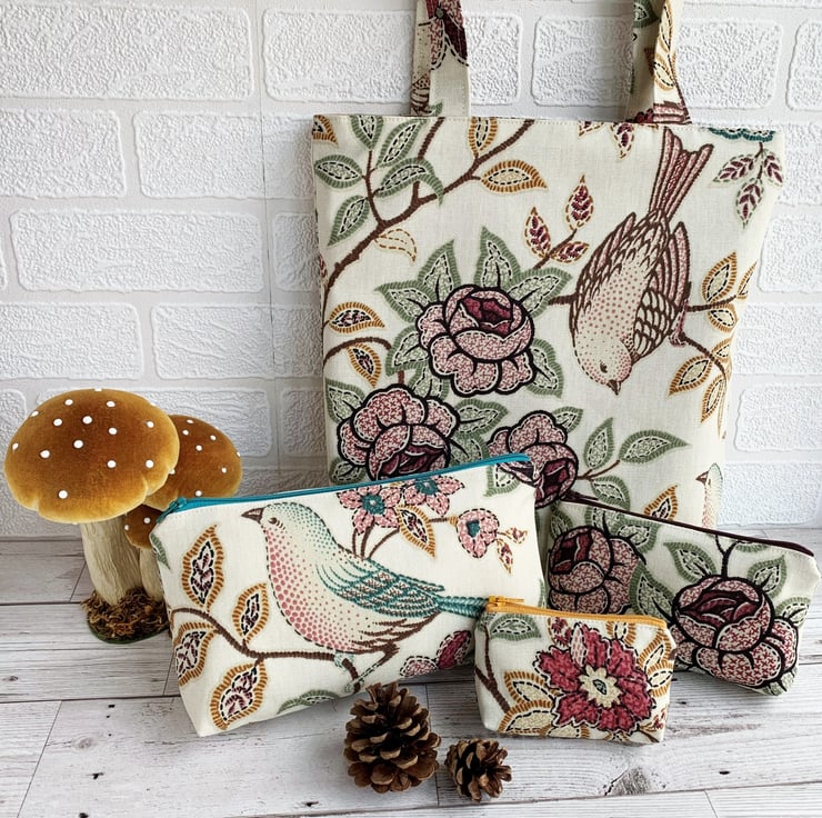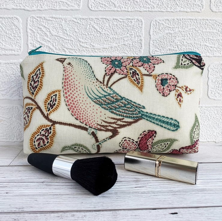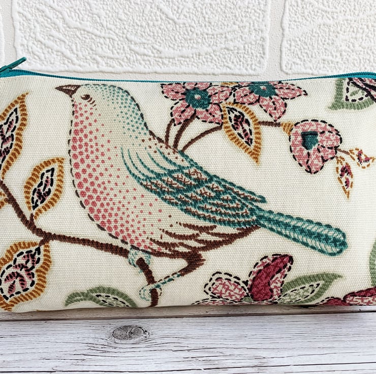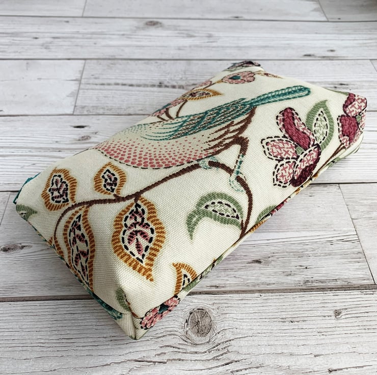 This pretty and spacious pouch can be used to store your cosmetics or could be used as a pencil case. With its delightful bird and floral print, it would make a lovely gift.